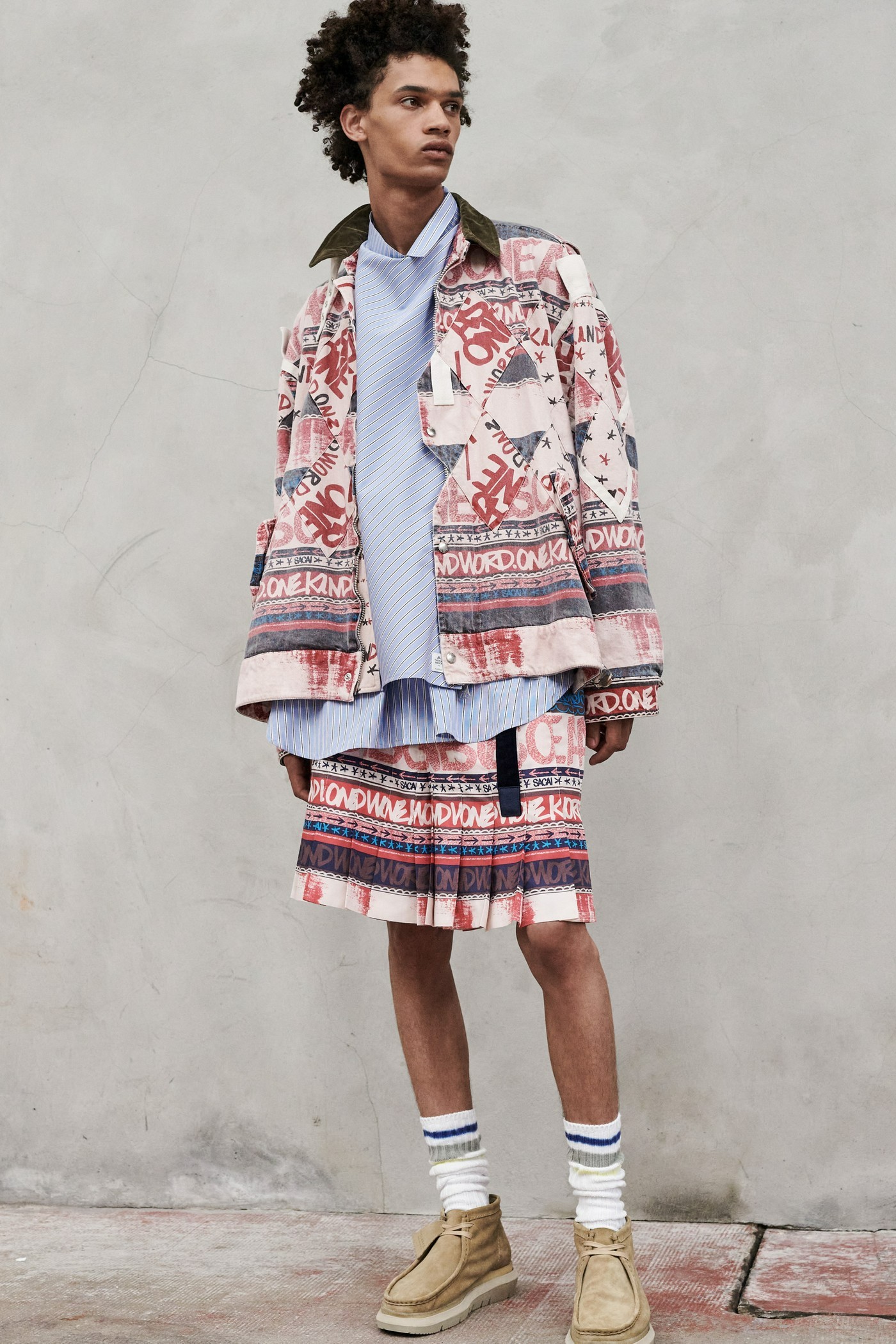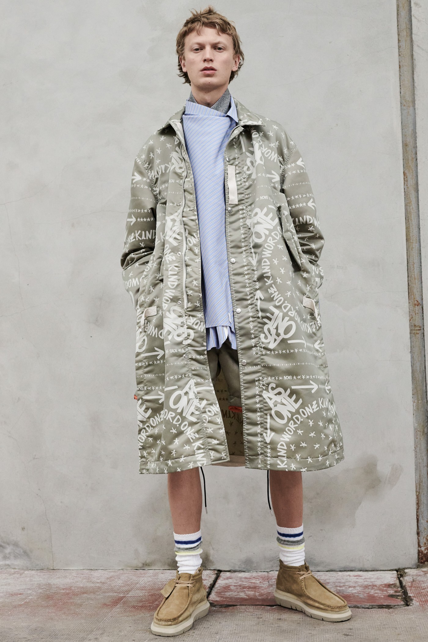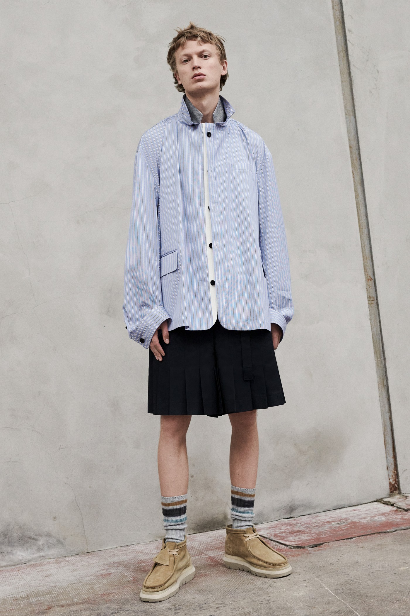 鞋款方面,棕色调 sacai x Clarks Wallabee 袋鼠鞋十分契合整套穿搭风格,可以说 sacai 每一季都能营造出不一样的视觉氛围。