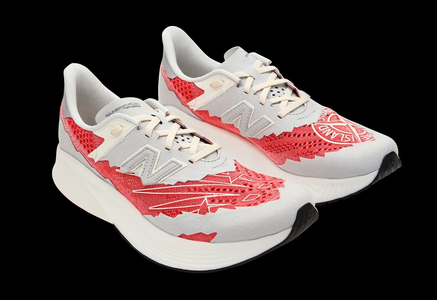 双方联名首发配色上最受好评的撕裂效果双层鞋面,以及不对称的鞋面石头岛指针 Logo 与飘速风格的 NB 标志都得以完美继承。