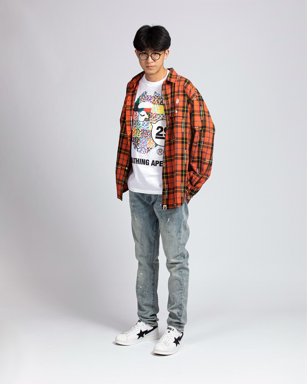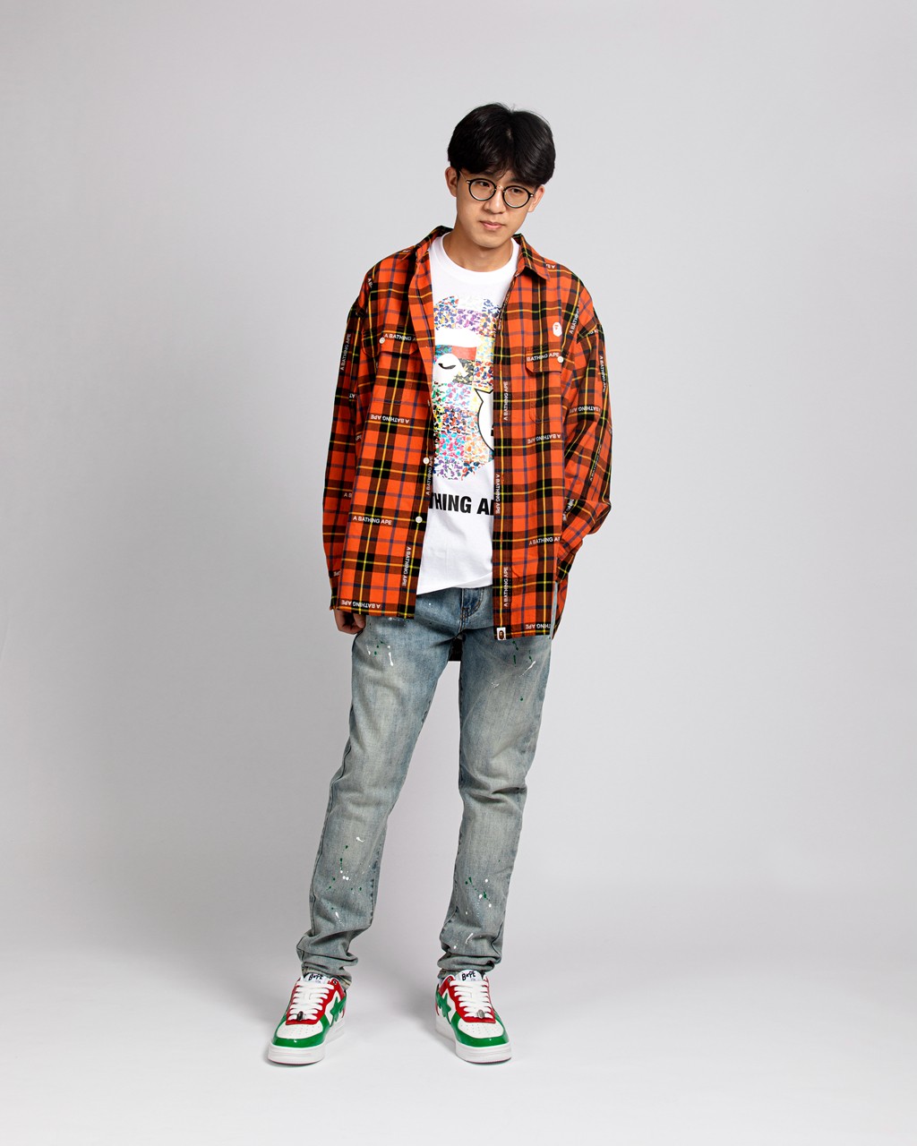 这次搭配的服饰也大有来头, BAPE® 新款格纹长袖衬衫,面料厚实挺阔,橘色上身效果足够吸睛。