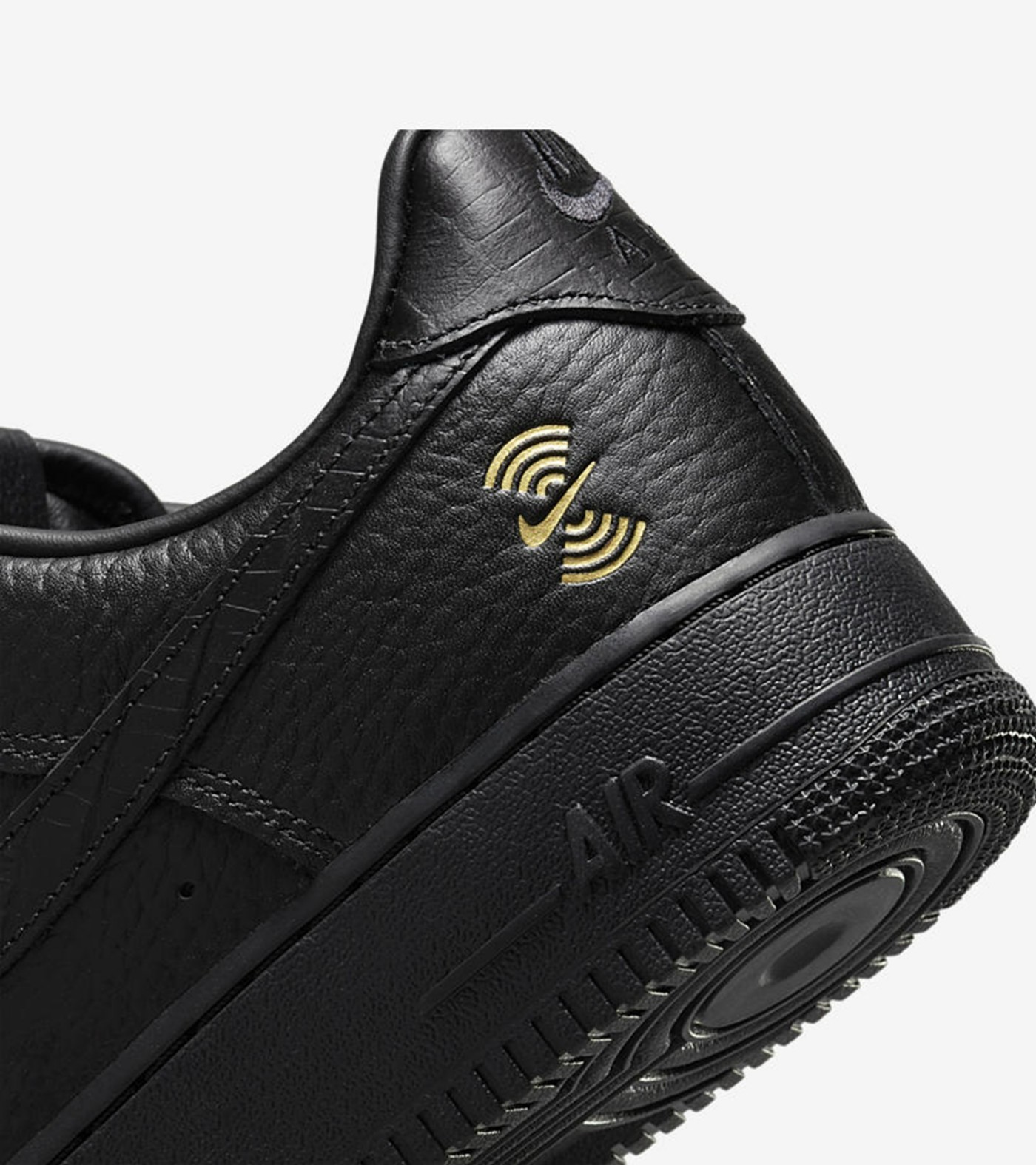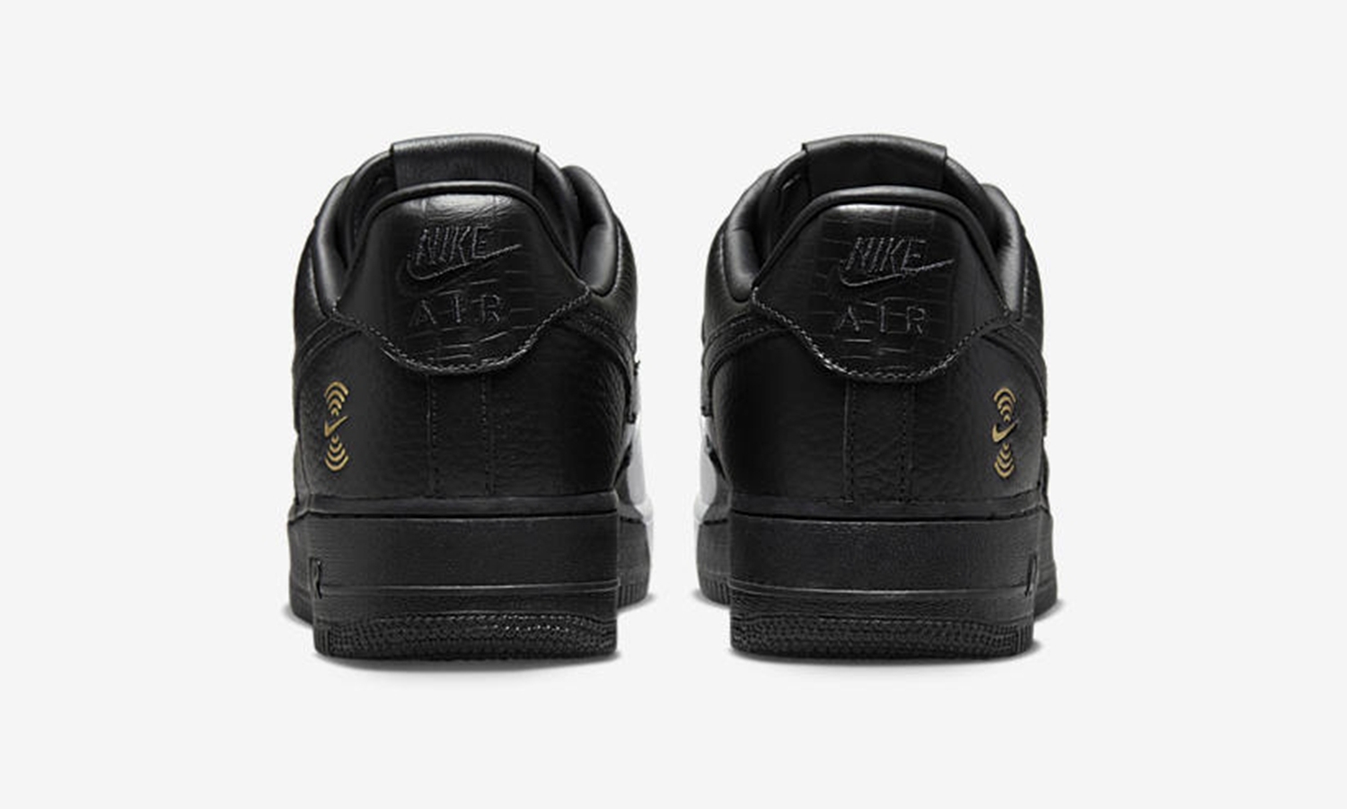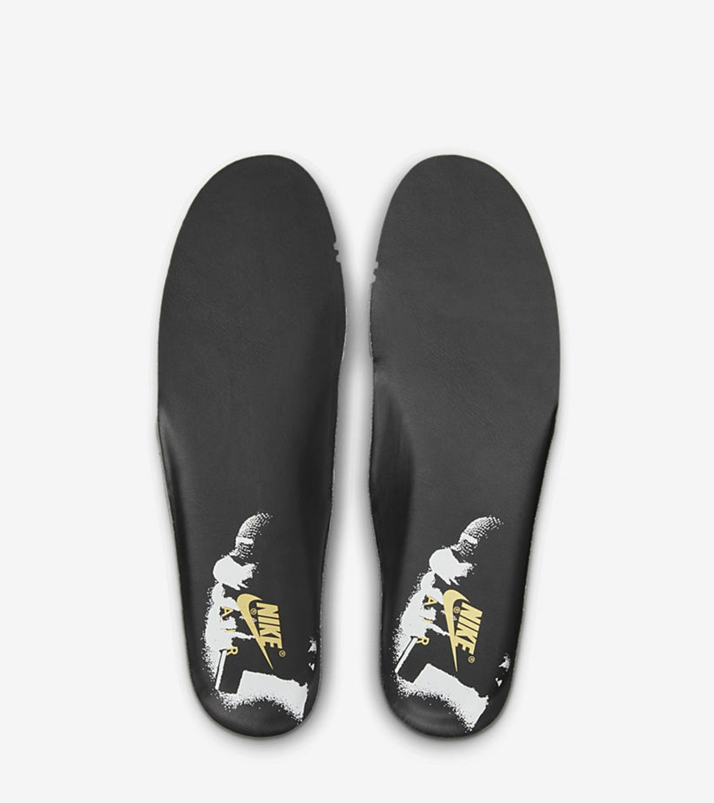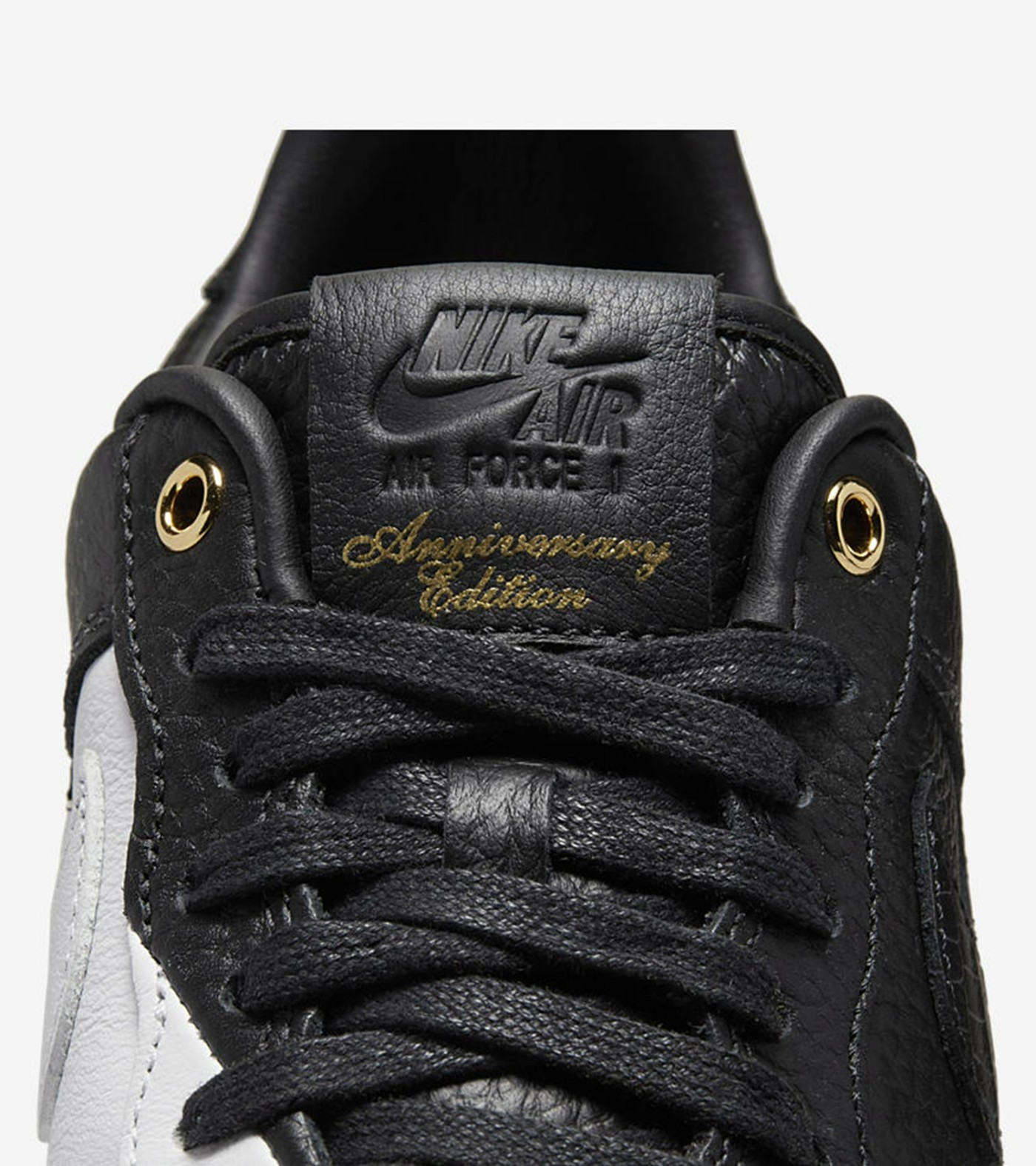 鞋舌上的皮质织唛和压印 Nike Logo 彰显奢华质感,另外还有金色周年纪字样,诠释配色主题。
