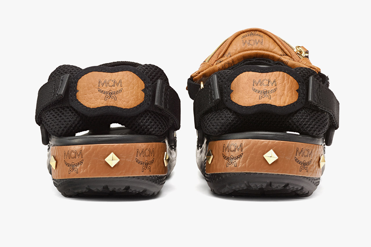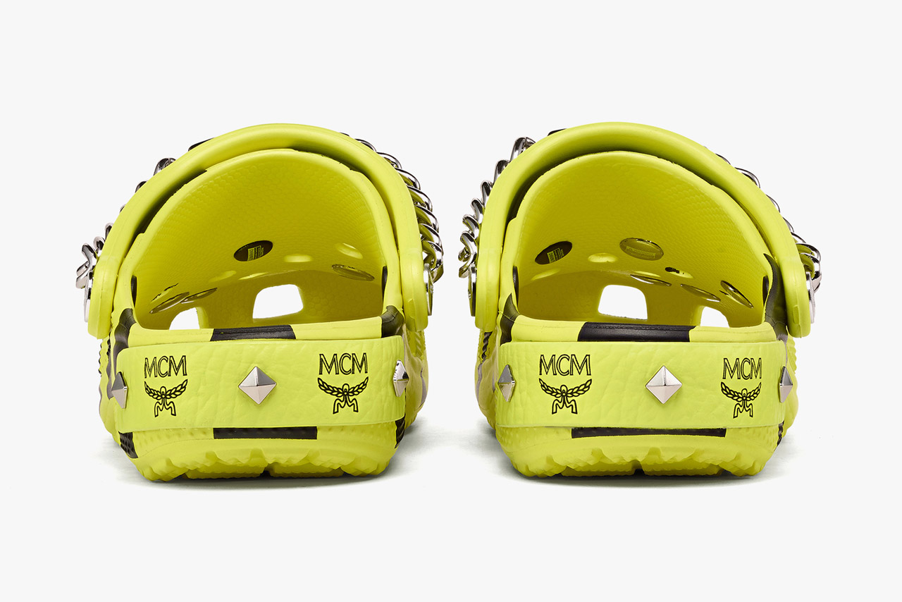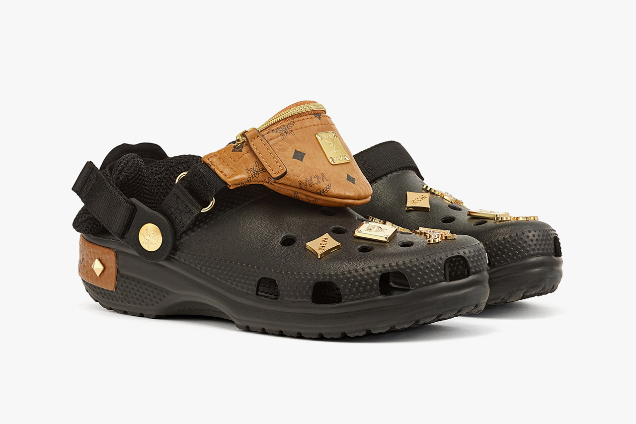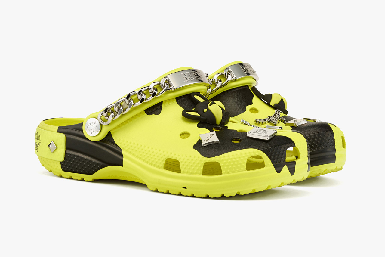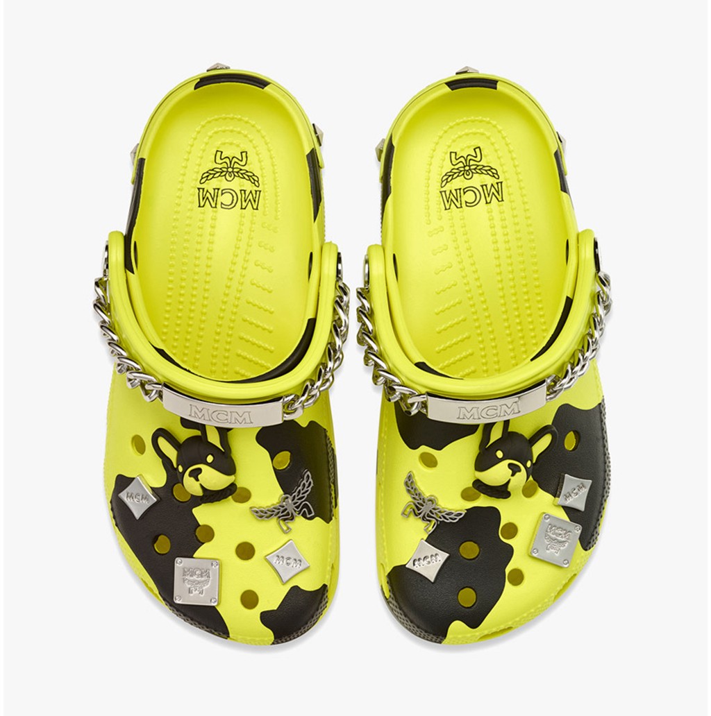 将经典的 Crocs 沙滩鞋造型与 MCM 的贴花和 Visetos Monogram 完美融合,带来两双全新款式:带有迷你腰包的黑金款和更具活力的荧光黄迷彩款。