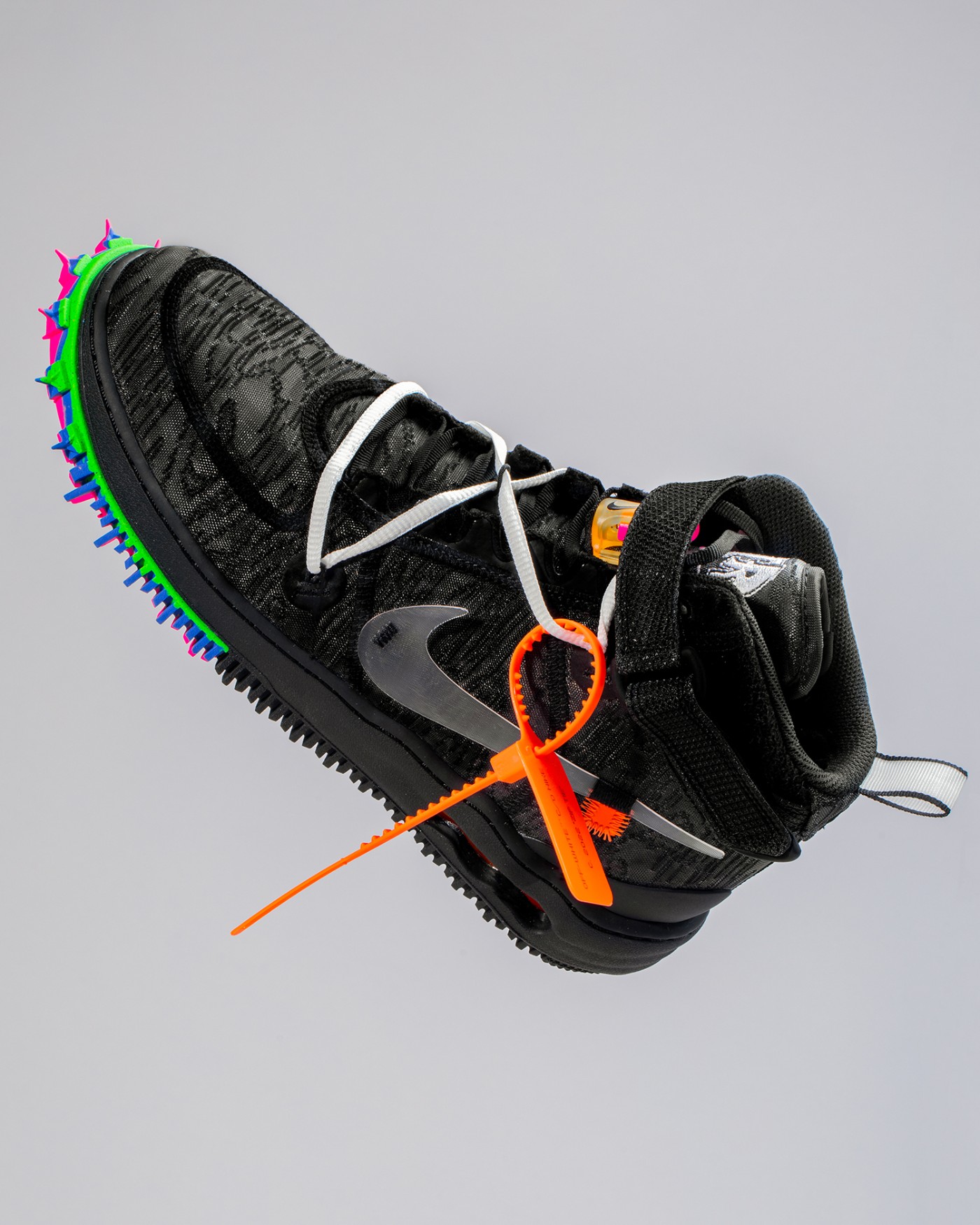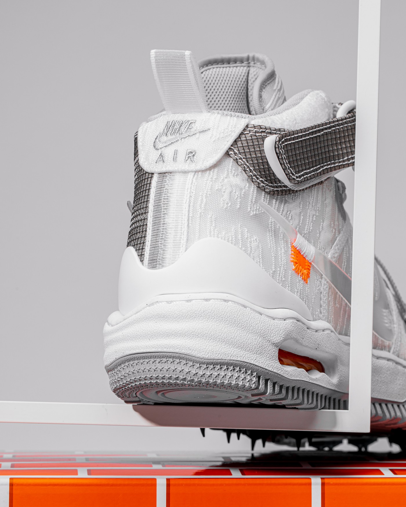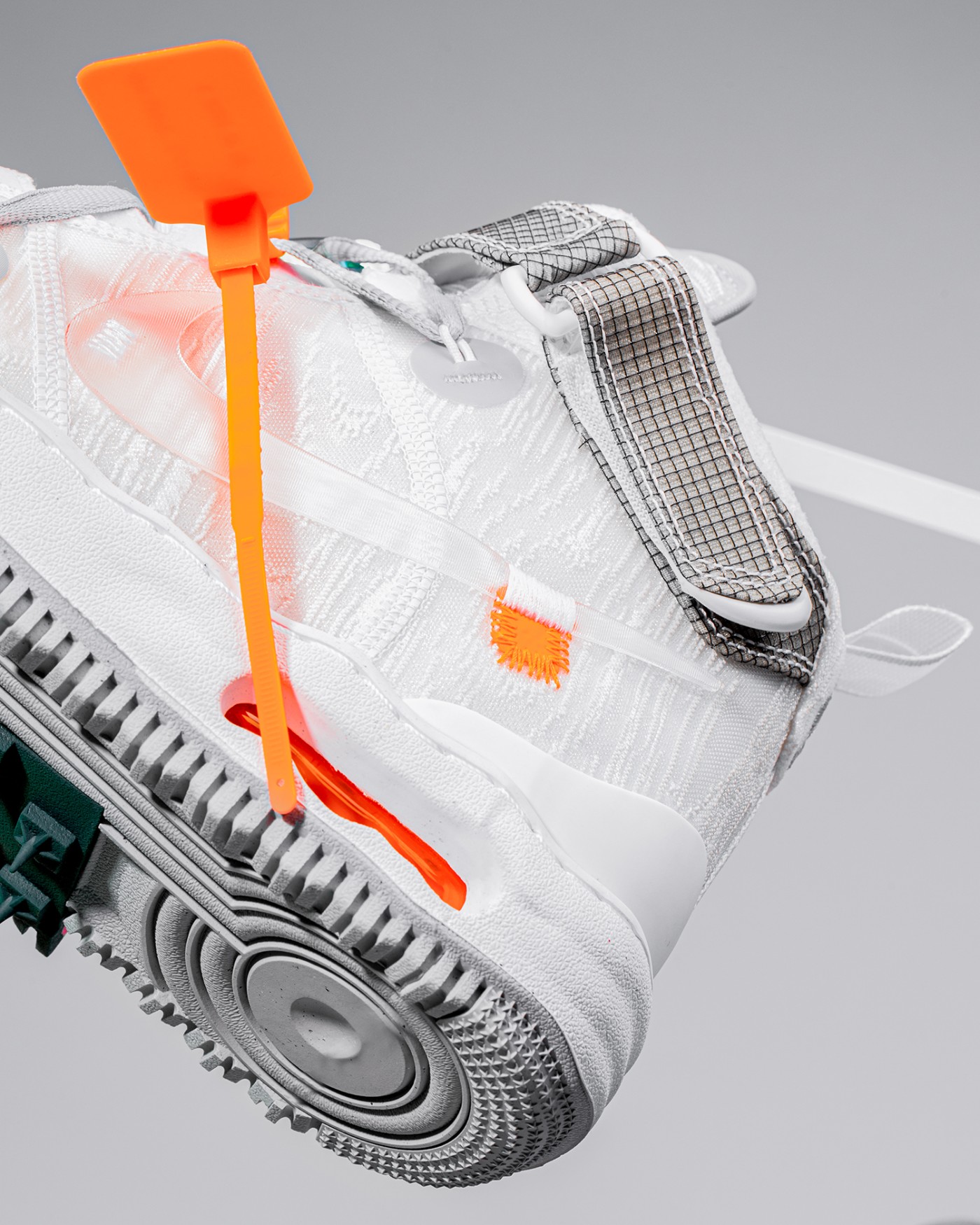 整双鞋的细节设计,真的是与 Virgil 的「3% 设计理念」完全相反,夸张一点说这双鞋除了以 Nike Air Force 1 Mid 作为原型,其他方面全部进行大刀阔斧的改动。