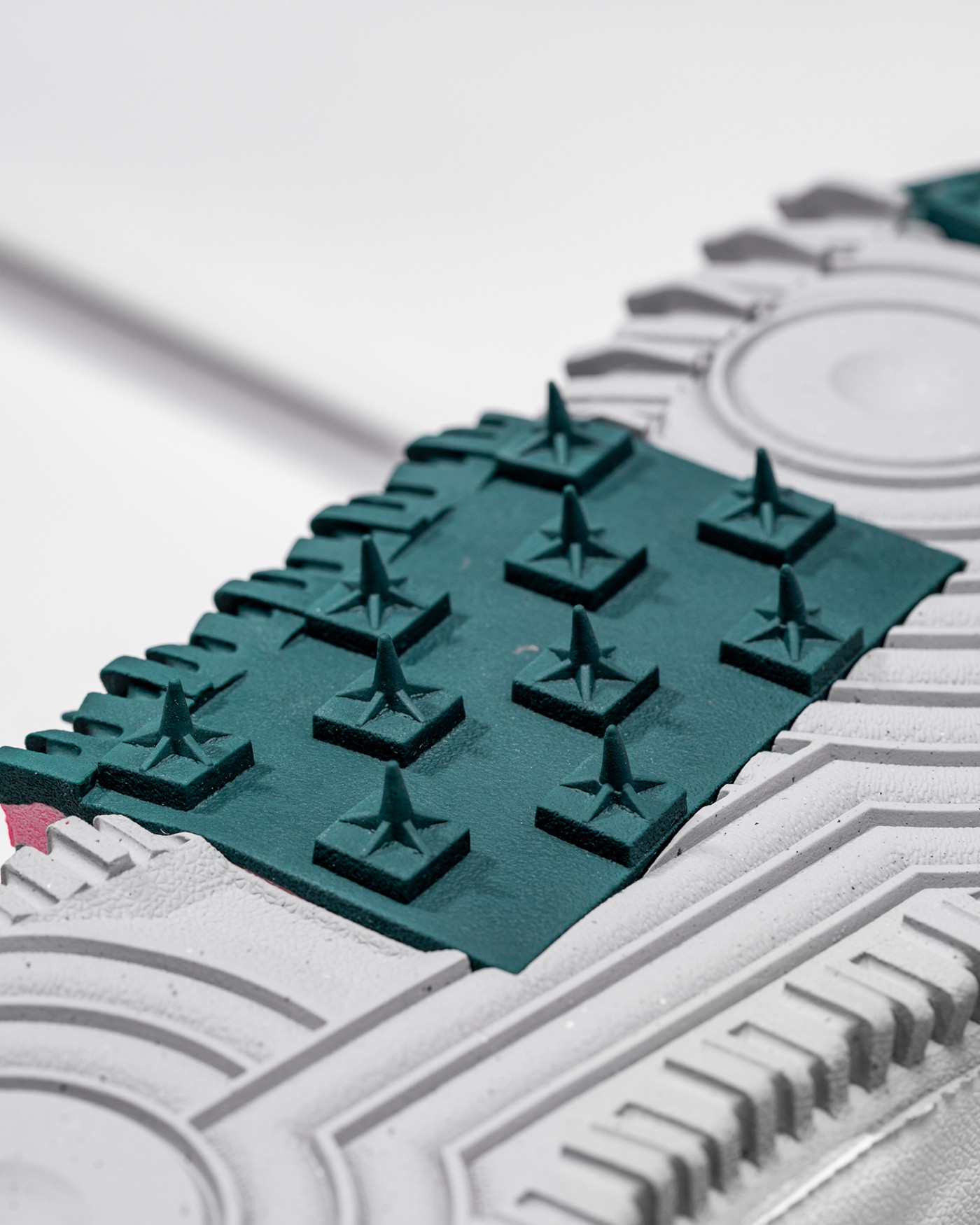 整双鞋最为夸张的地方就是嵌入中底以及外底的橡胶鞋钉设计。
