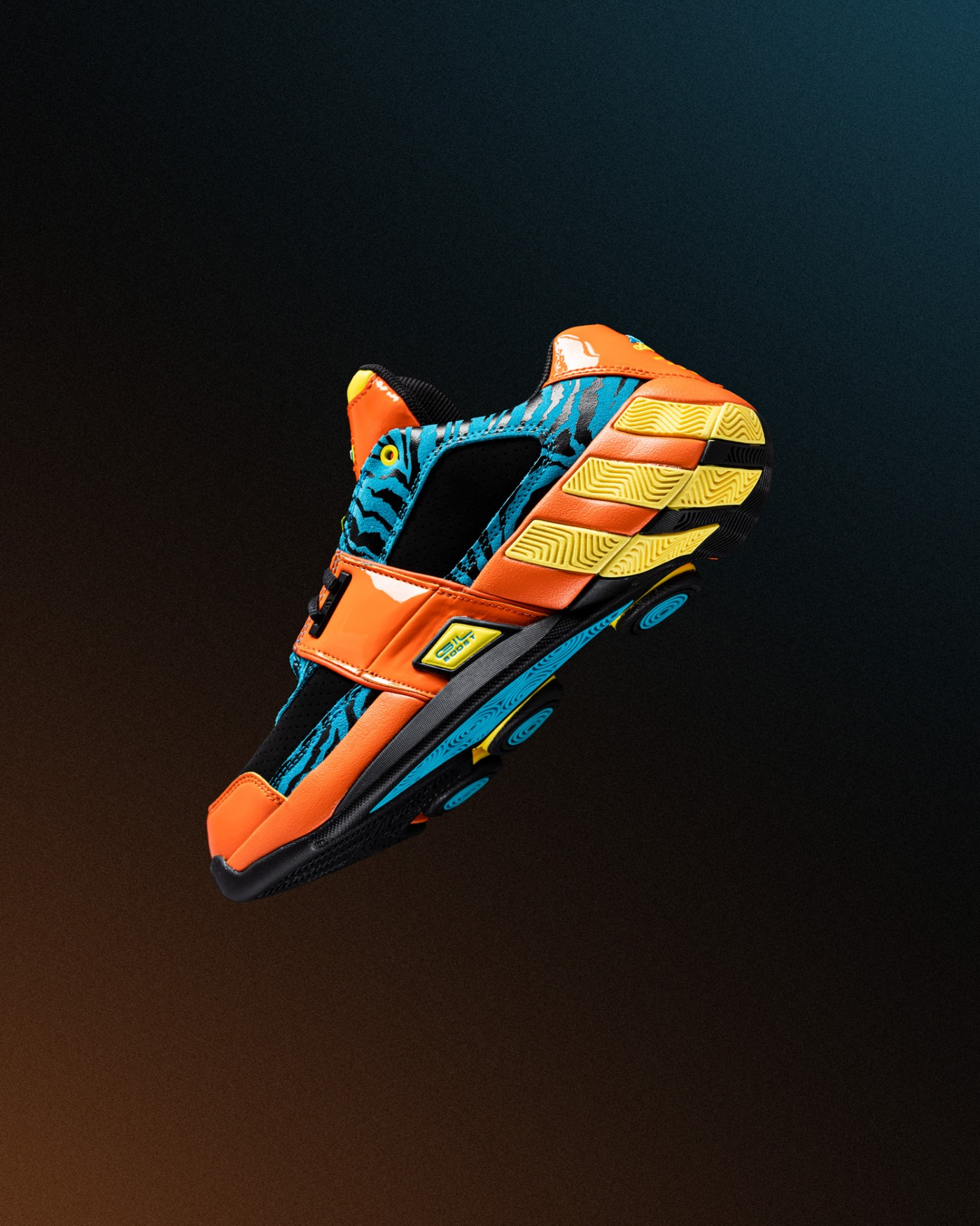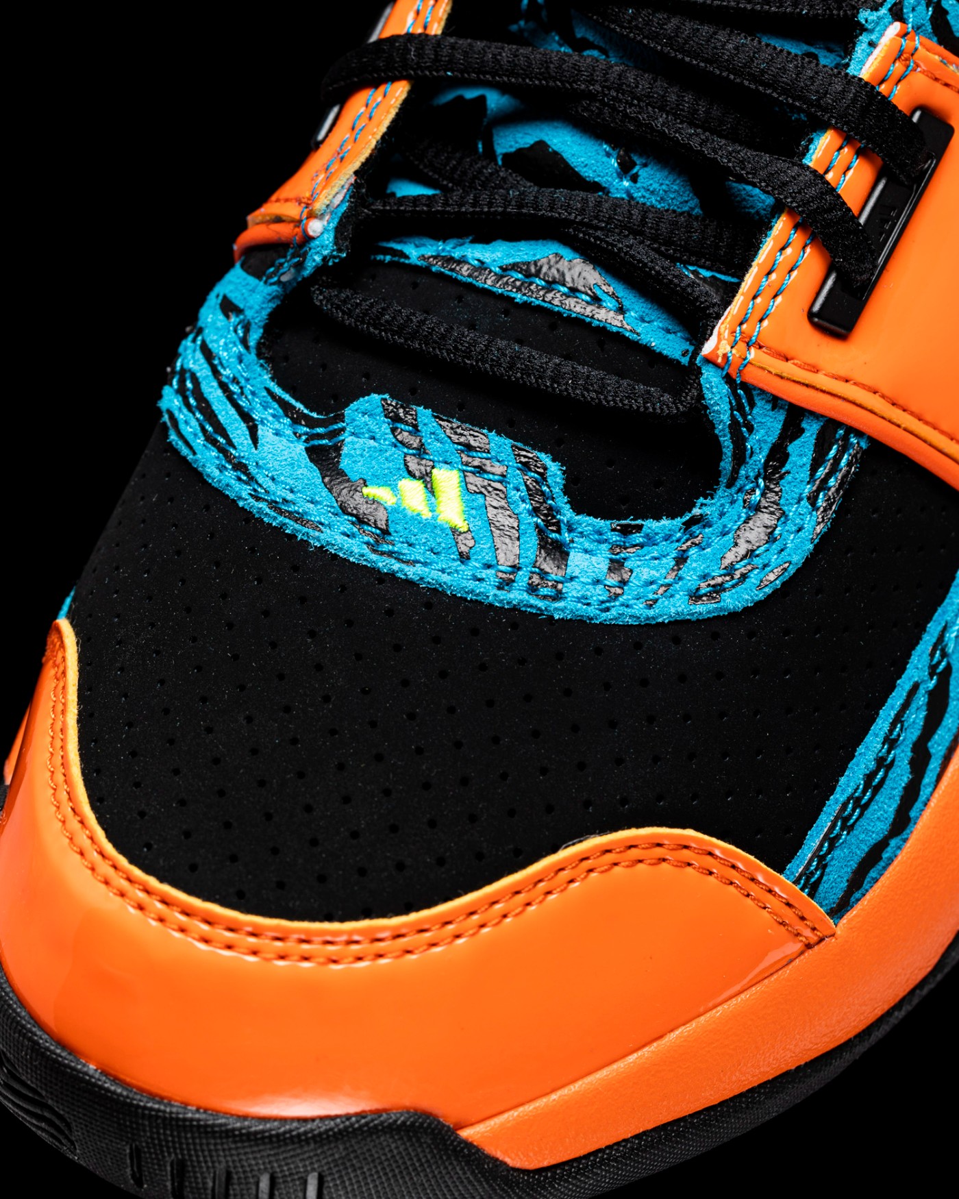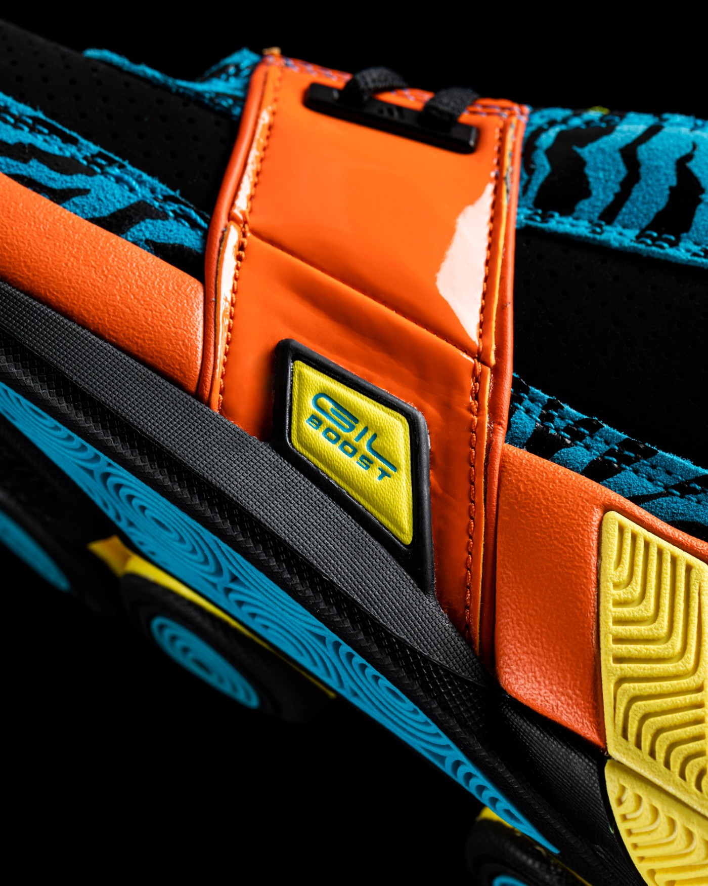 鞋身标志性稳定绑带采取橙色漆皮材质打造,致敬元年款式的设计。