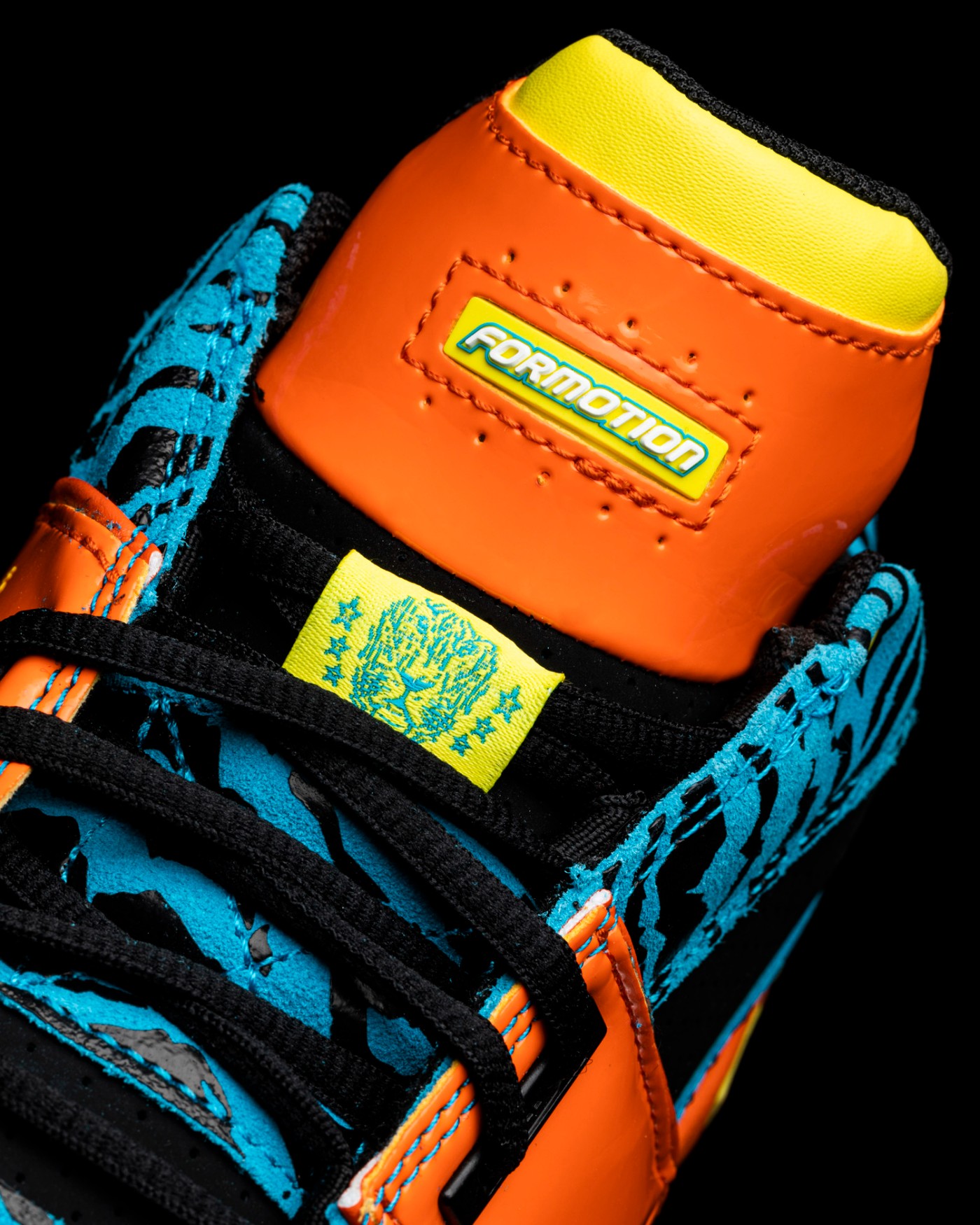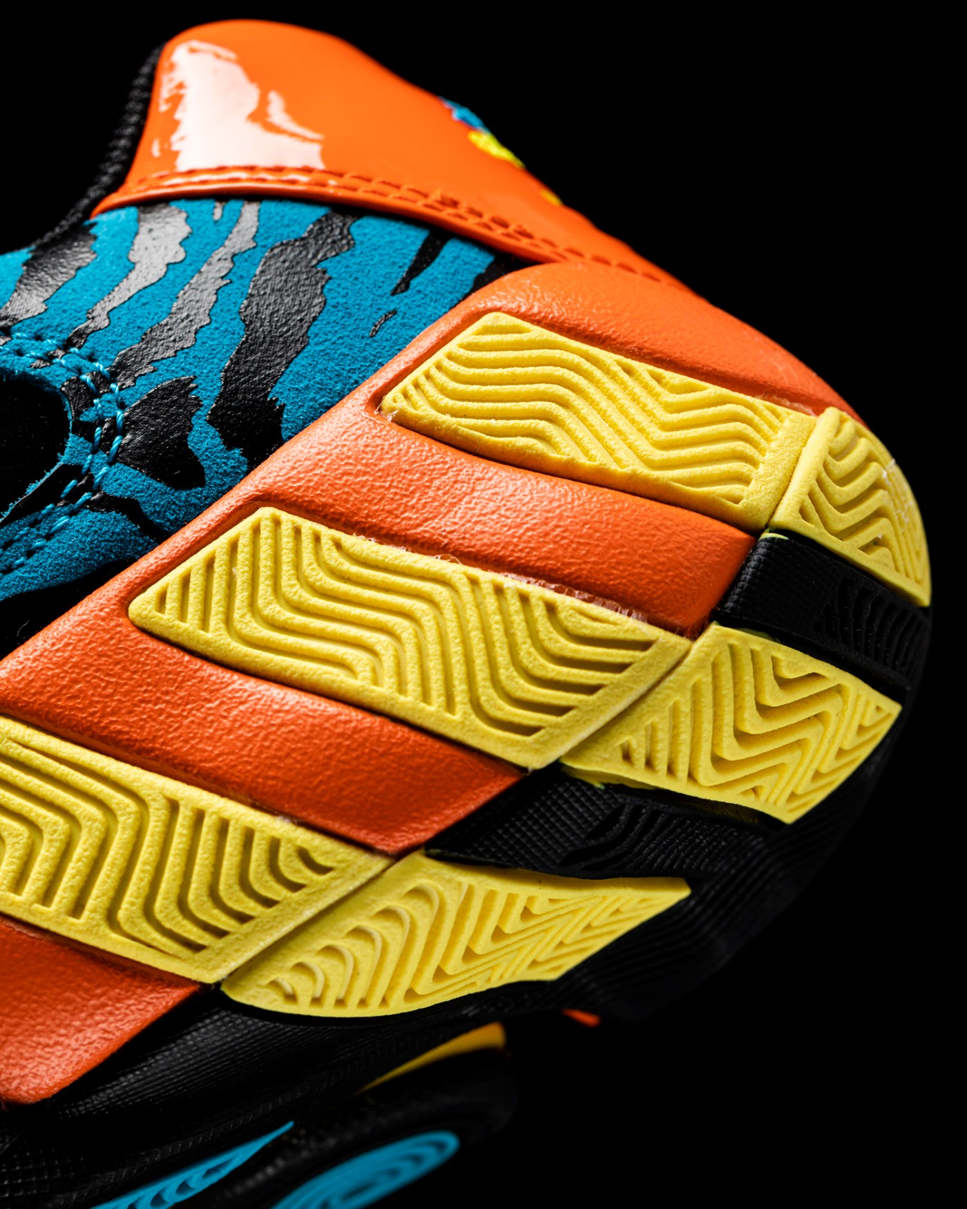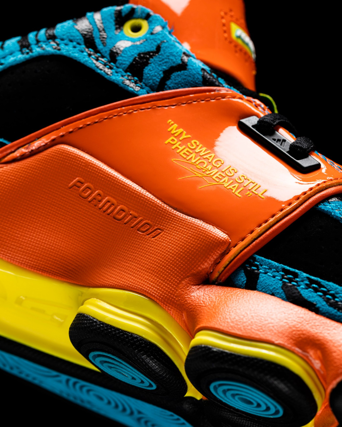 鞋身标志性稳定绑带采取橙色漆皮材质打造,致敬元年款式的设计。