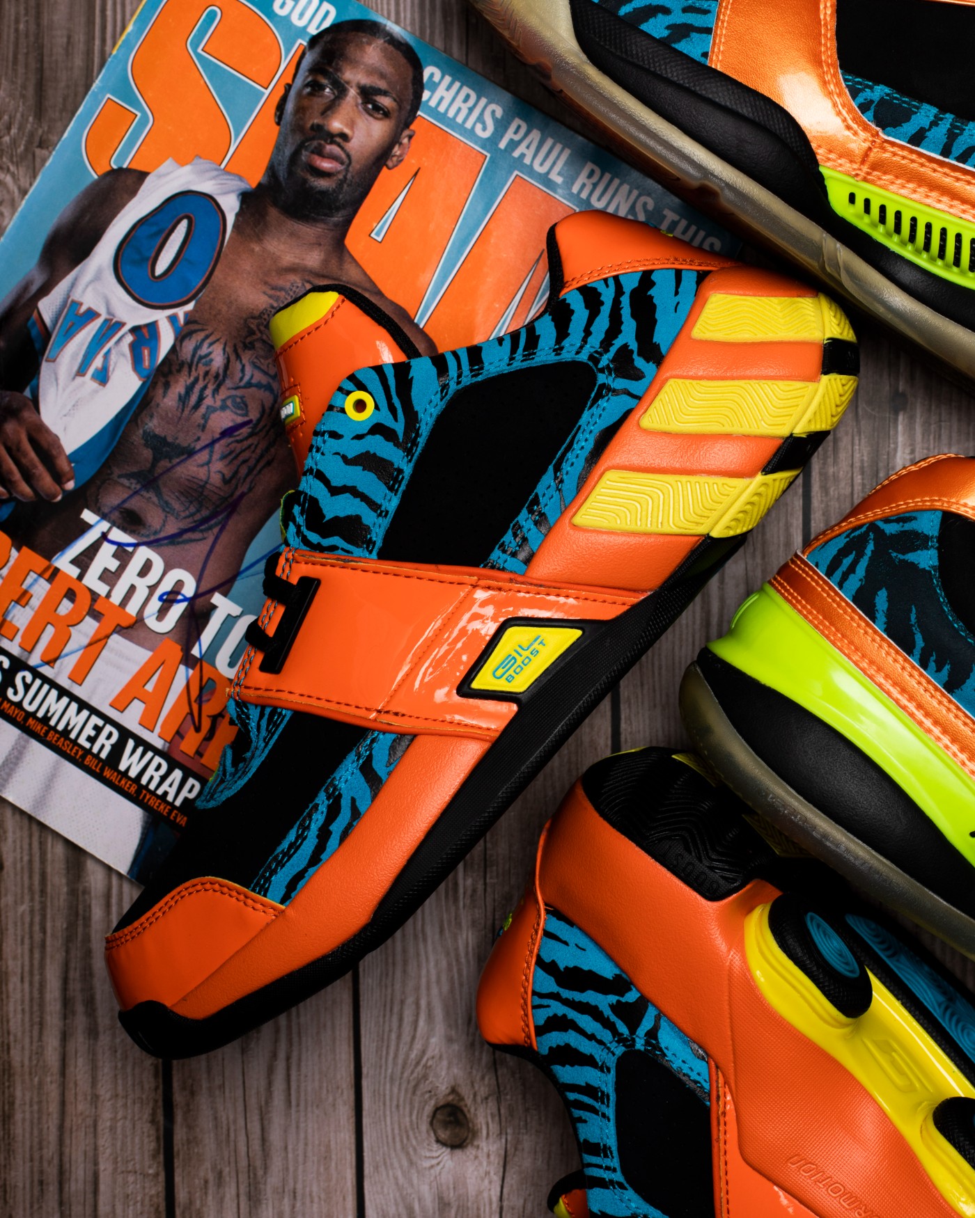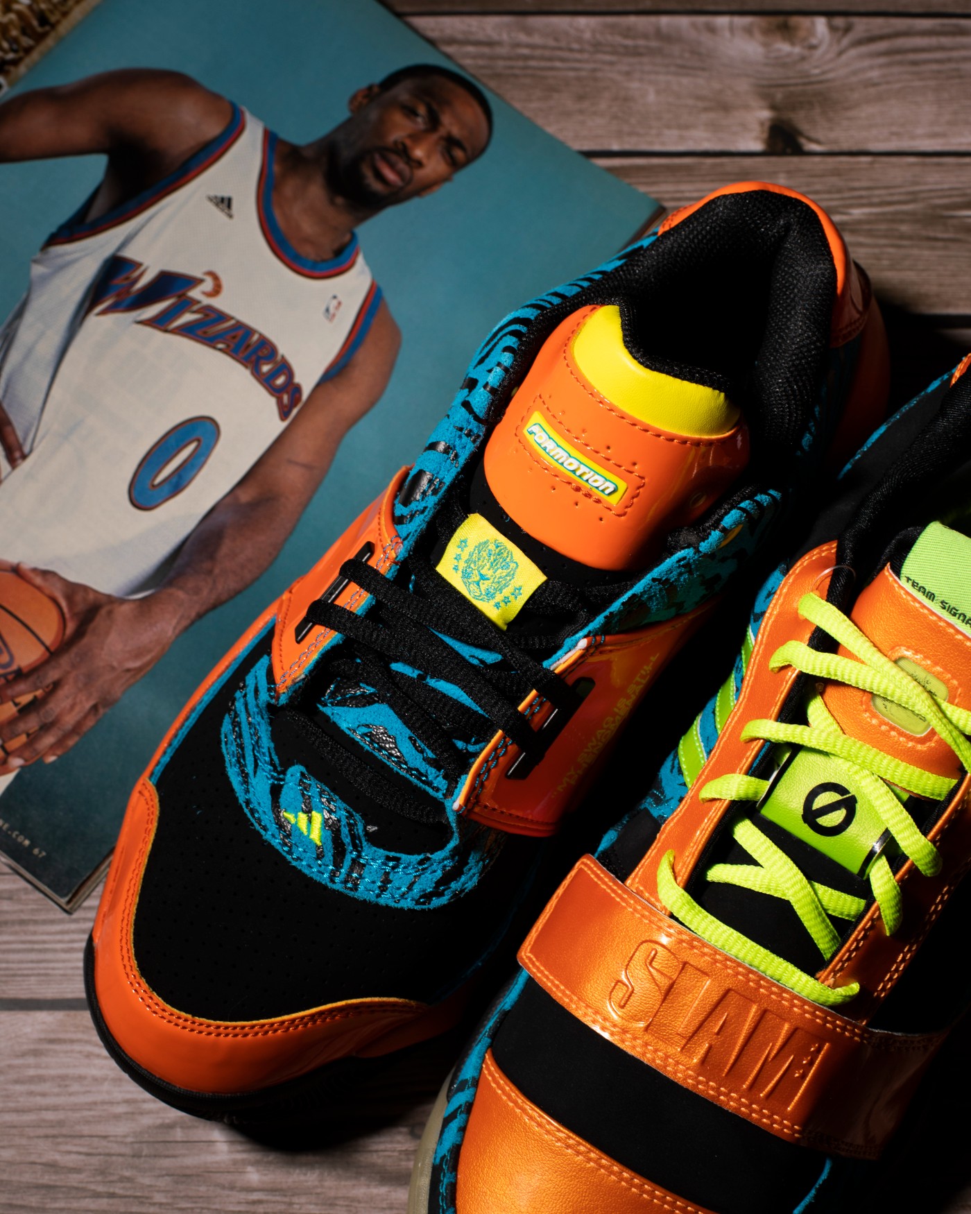 不难发现,鞋身橙色 + 湖蓝色的主色调就是来自当年那一期 SLAM 杂志的封面设计。