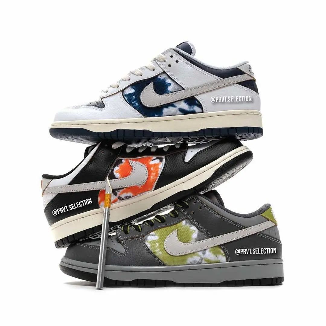 海军蓝色 SB Dunk 致敬了主理人 Keith Hufnagel 出生和长大的纽约市,另一双撞脸「熊猫」Dunk 的黑白款则致敬了 HUF 在 2002 年在旧金山开设的店铺,下面这双白绿扎染配色或许是亲友限定款。