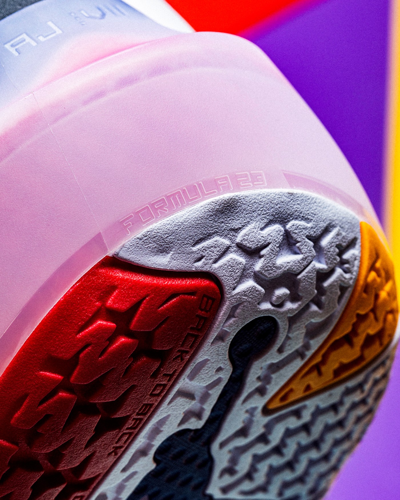 后跟搭载了最新高性能缓震泡棉 Formula 23,在起跳前带来强劲蓄能反馈。