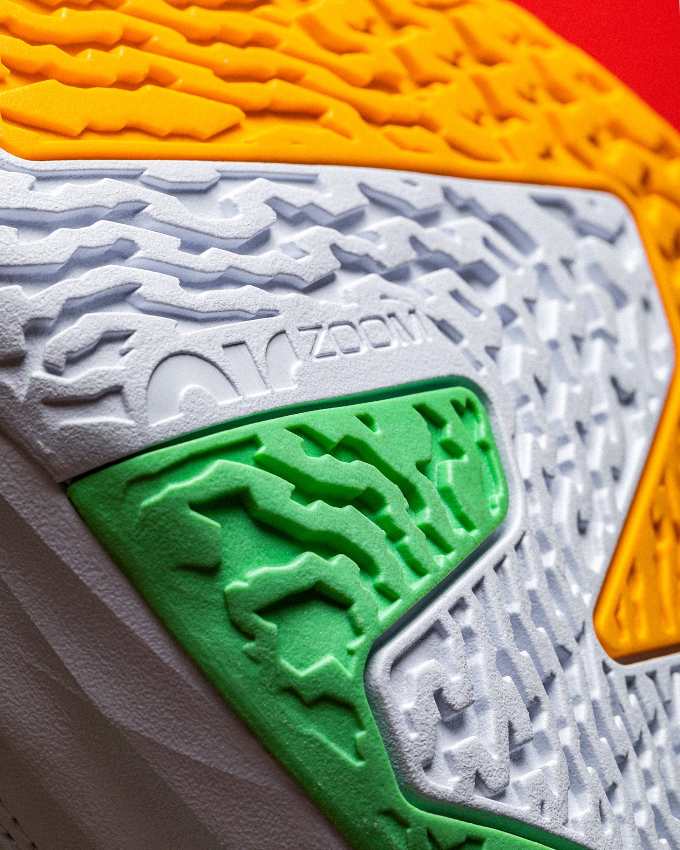 外底采用了粗犷的曲折纹路,分区和配色设计都致敬了 Air Jordan 7。