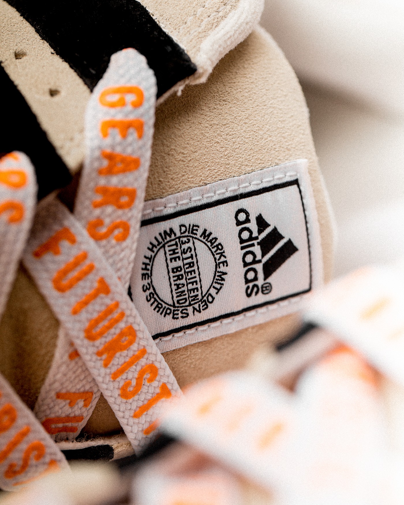 除了纯白鞋带,随鞋还附赠了一黑一白两副特殊鞋带,鞋带上胶印有 Human Made 经典标语「Gears for Futuristic Teenagers」。