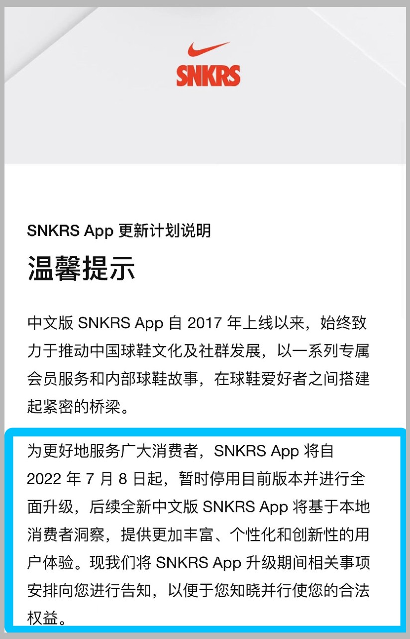 结合此前大家使用的 SNKRS 已暂停服务并全面升级的消息。