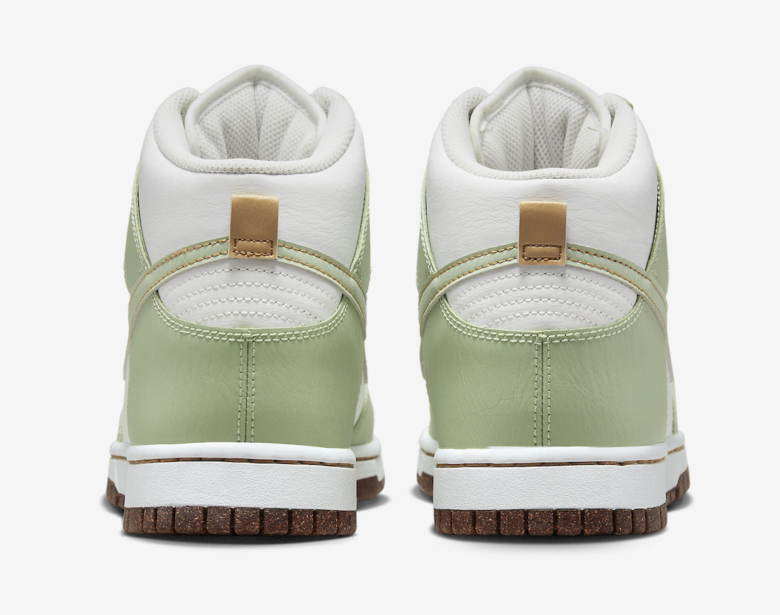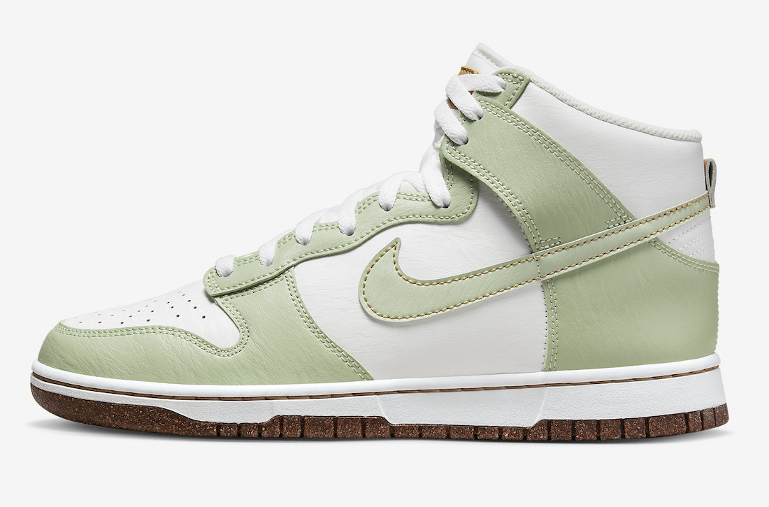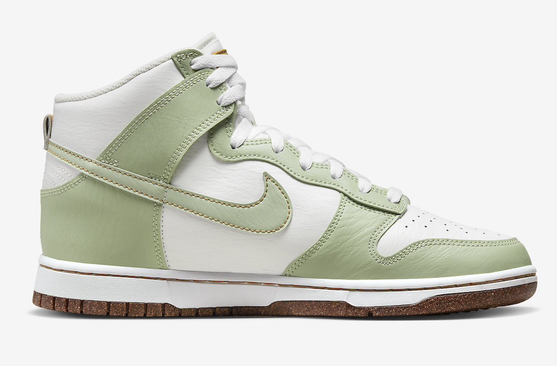 选用高帮 Dunk 鞋型,主体配色几乎与鼠尾草如出一辙,纯白底色搭配浅绿色,造型依旧清新可人。