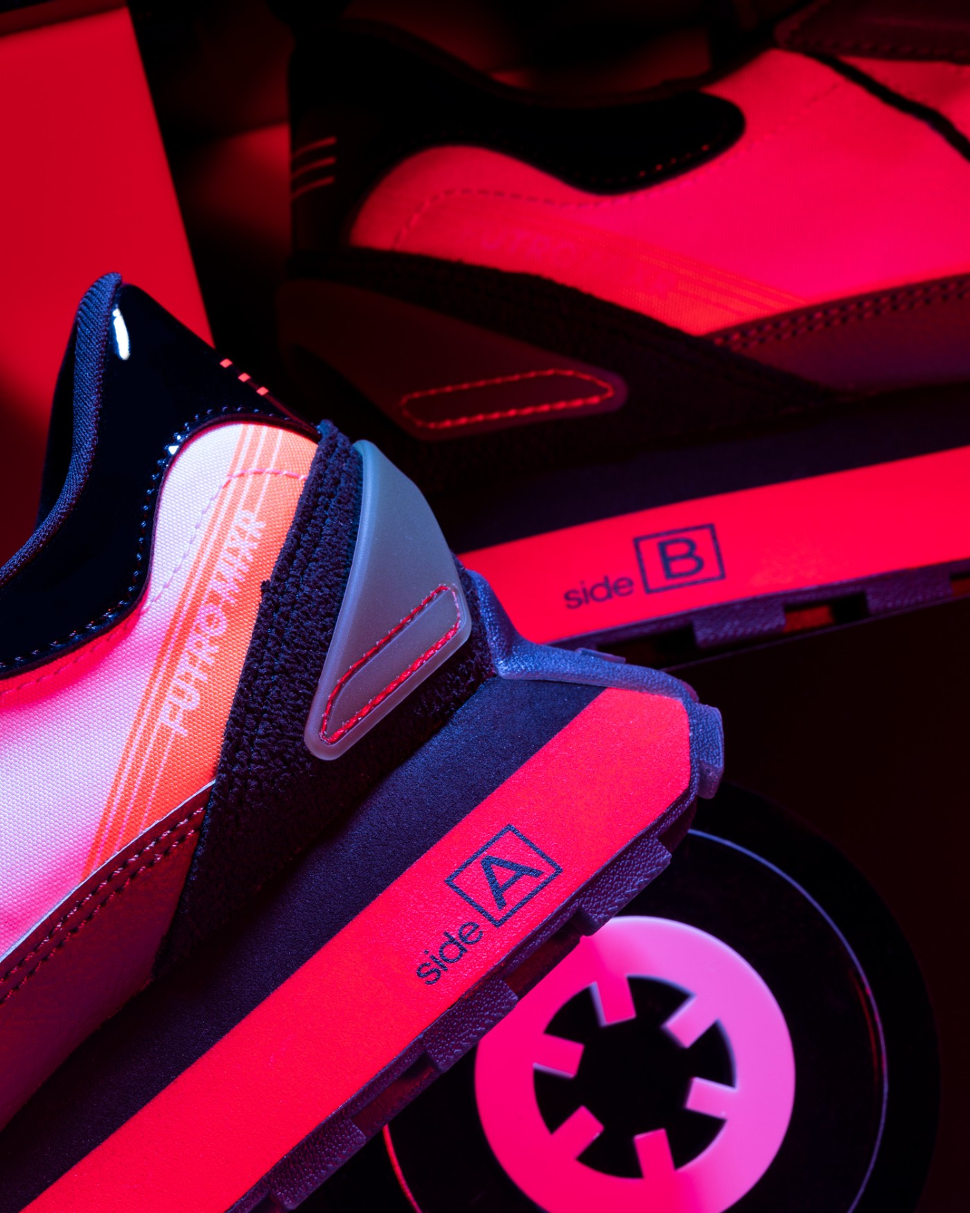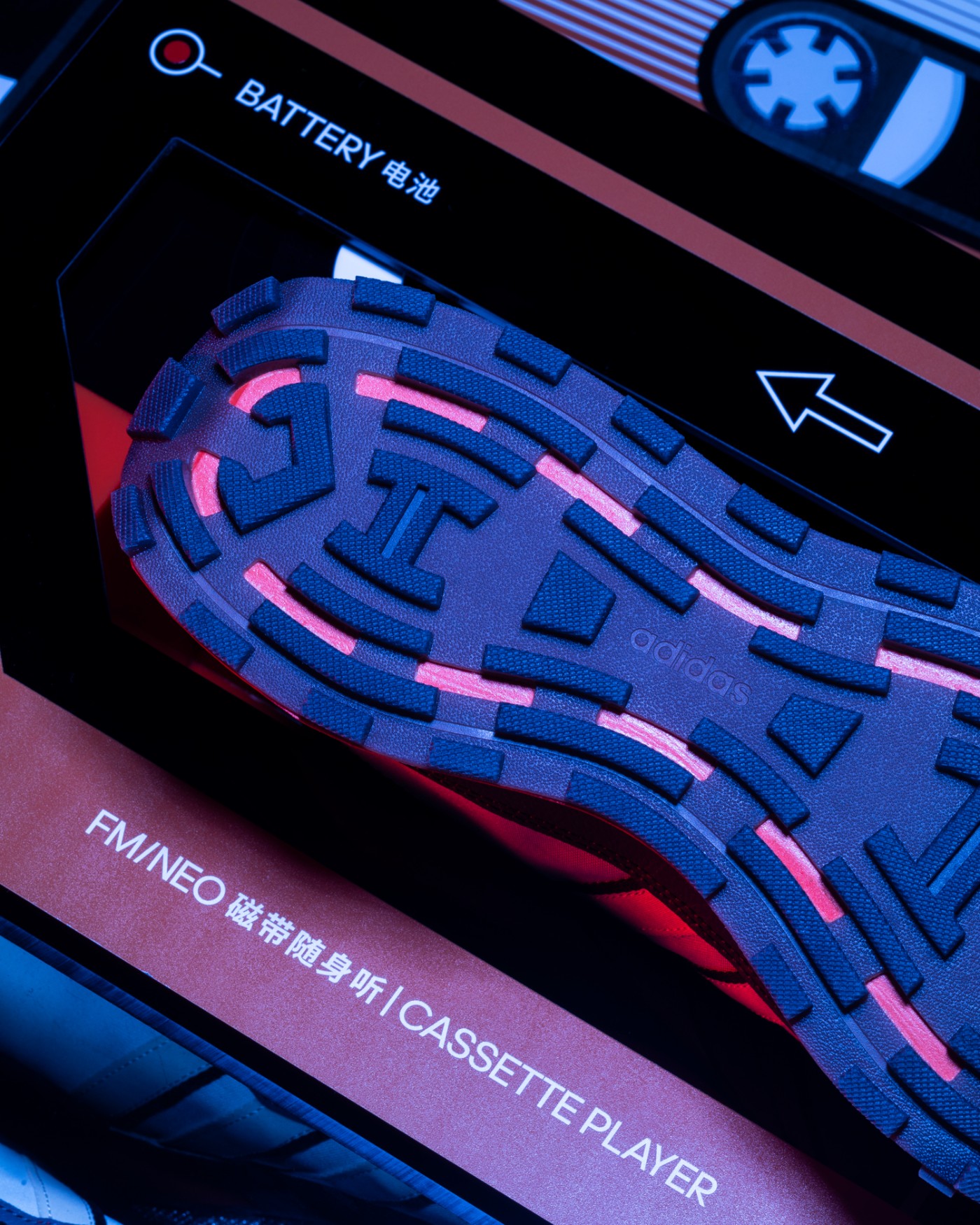 这次 adidas neo 选择了磁带随身听这个复古元素,鞋盒外观就完全参照了随身听设计,非常有趣。