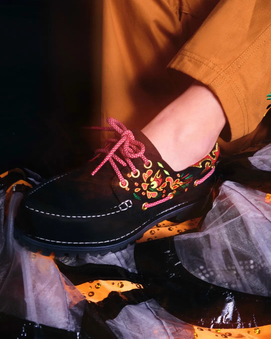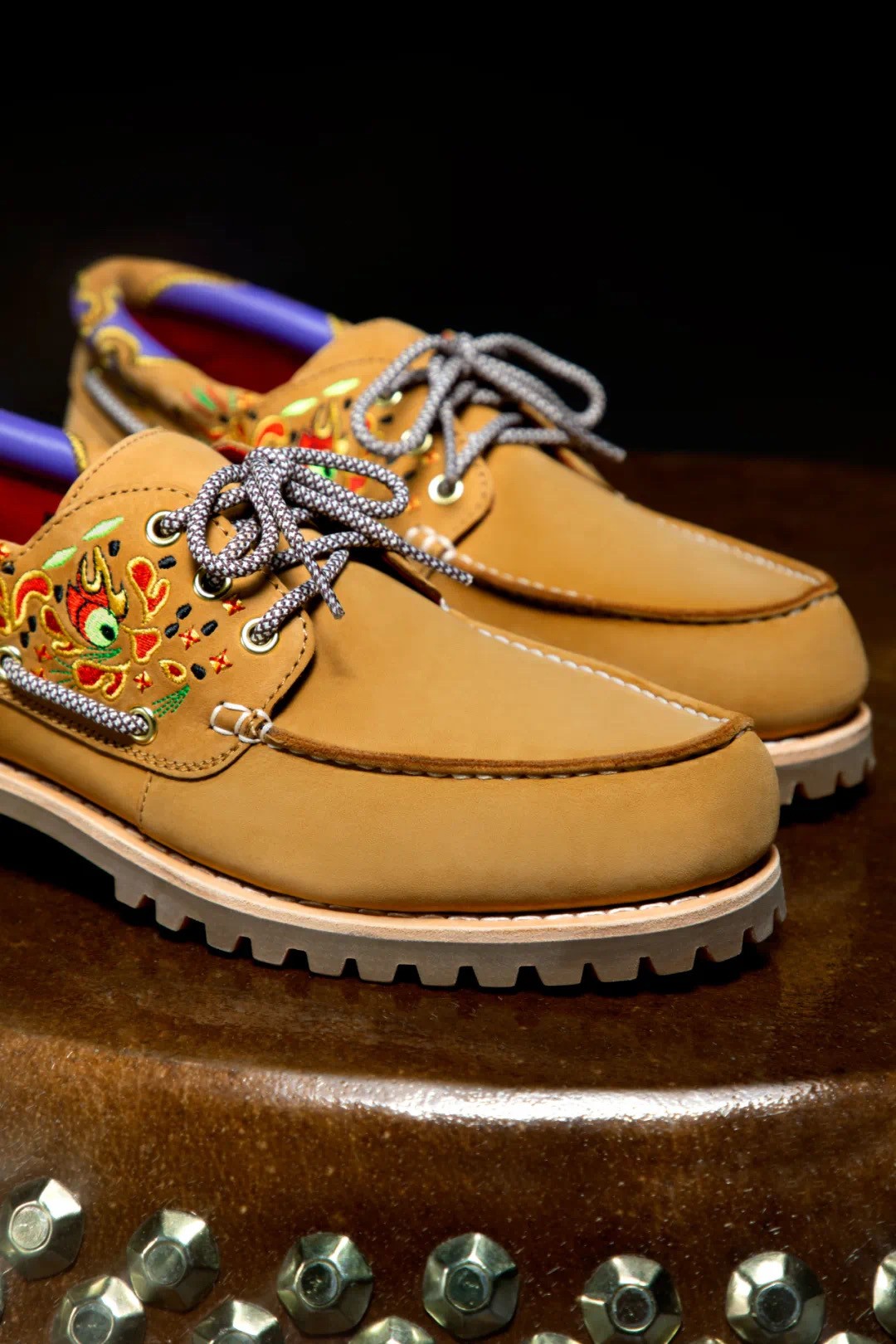 本次联名系列包含男、女款鞋履及多款服饰,其中 CLOT 以东方传统文化中的神龙为灵感元素,为经典三眼手工缝制船鞋(3-Eye Lug Handsewn boat shoe)注入独一无二的东方美学。