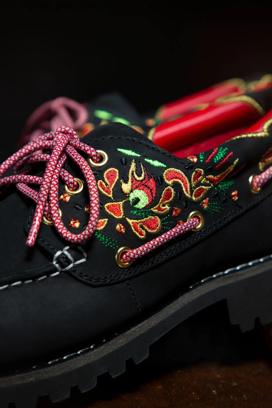 为更细致地体现龙的神韵,经典的三孔帆船鞋被换上了新的鞋型!上翘鞋头设定令整体轮廓仿似咆哮中的龙,其眼睛及火焰则由中国民族色彩的手工丝绣呈现,造就栩栩如生的龙头设计。