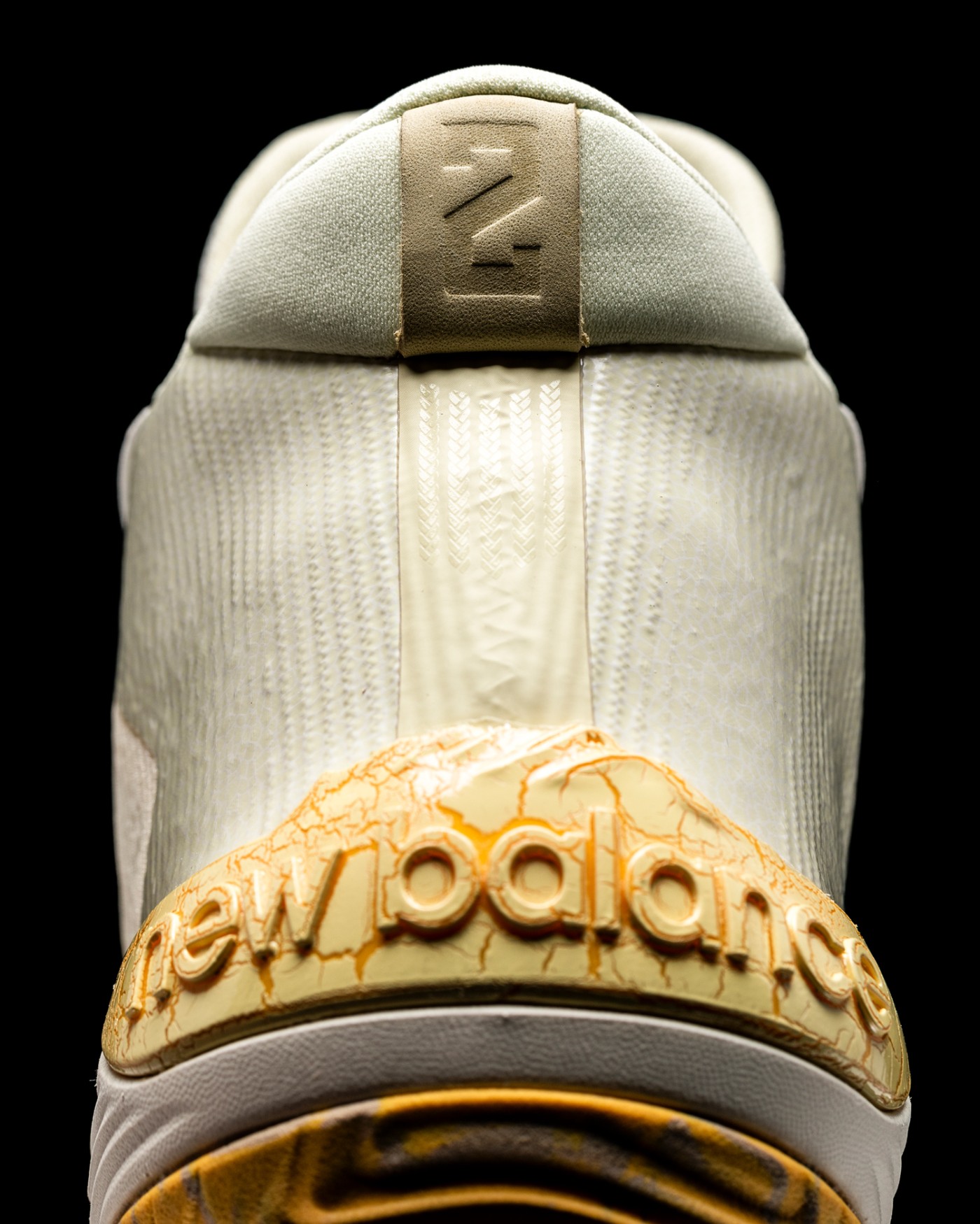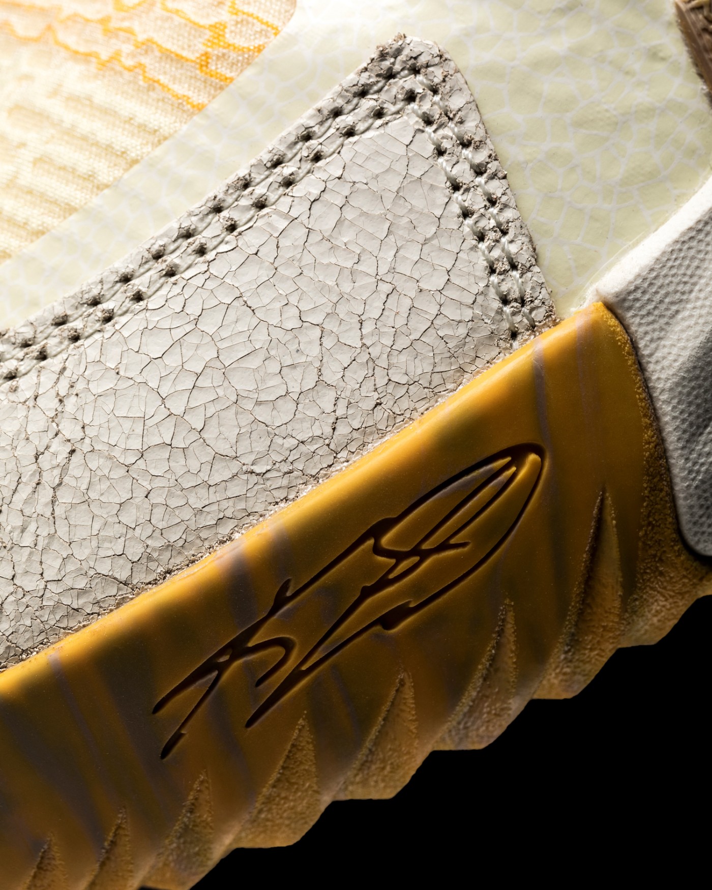 采用米黄为主色调,鞋头采用龟裂皮革材质,营造做旧质感。后跟山脉造型 TPU 也带有爆裂元素。