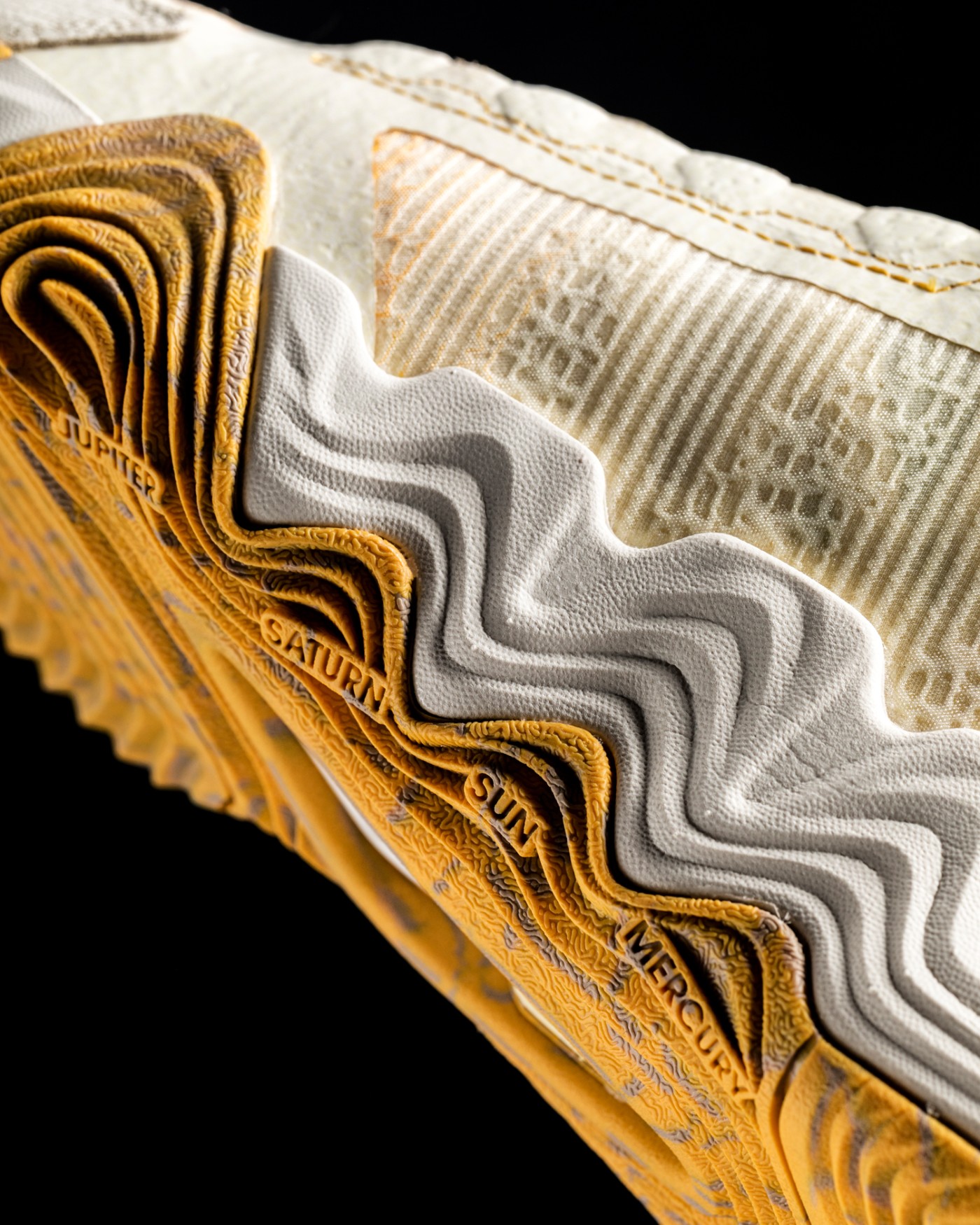 外底标注的「JUPITER」、「SATURN」、「SUN」等星球名称,其实是来自西方的手相学中掌纹与天体的对应关系。