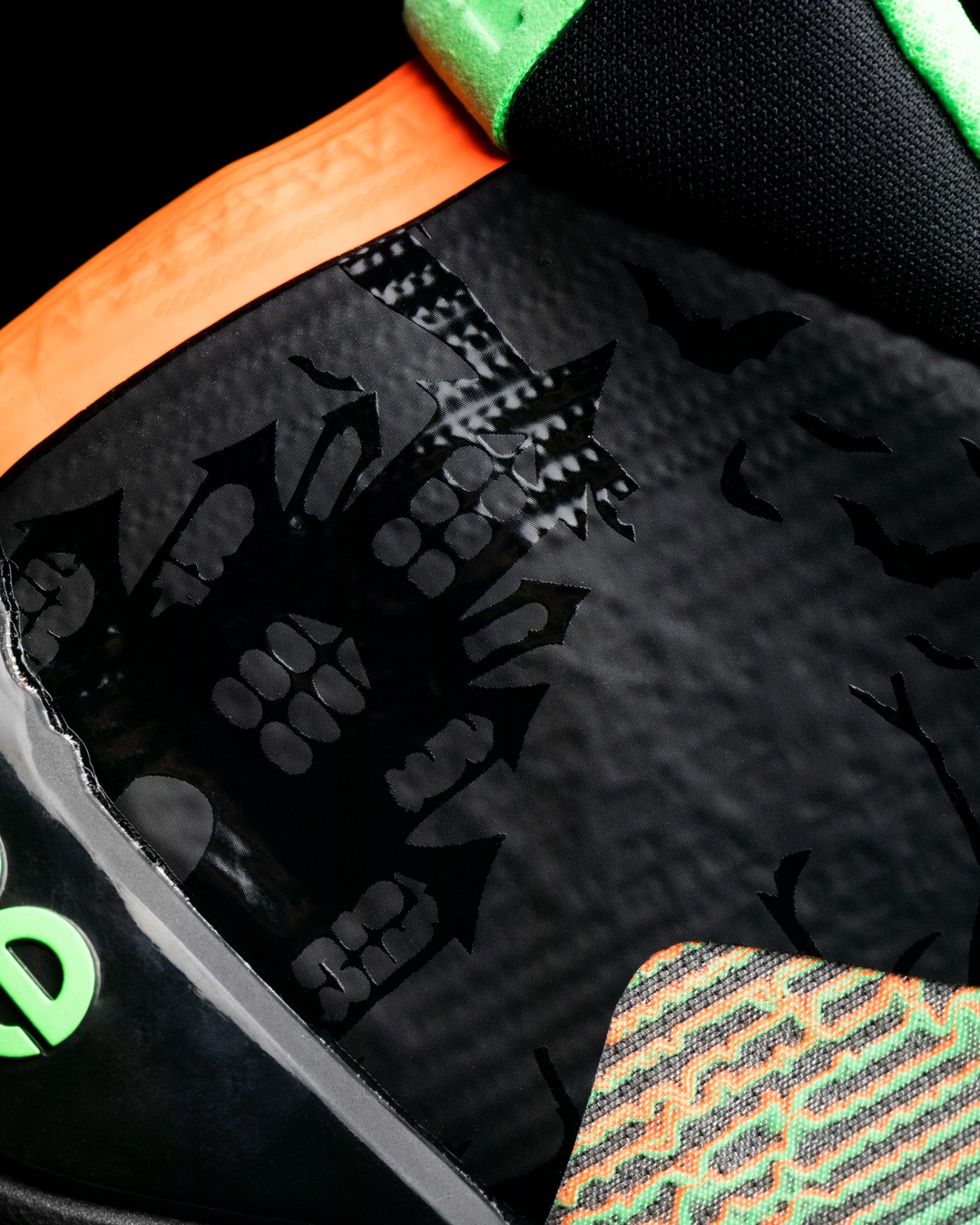 鞋身热熔部分都带有稻草人、古堡等恐怖元素的反光暗纹。