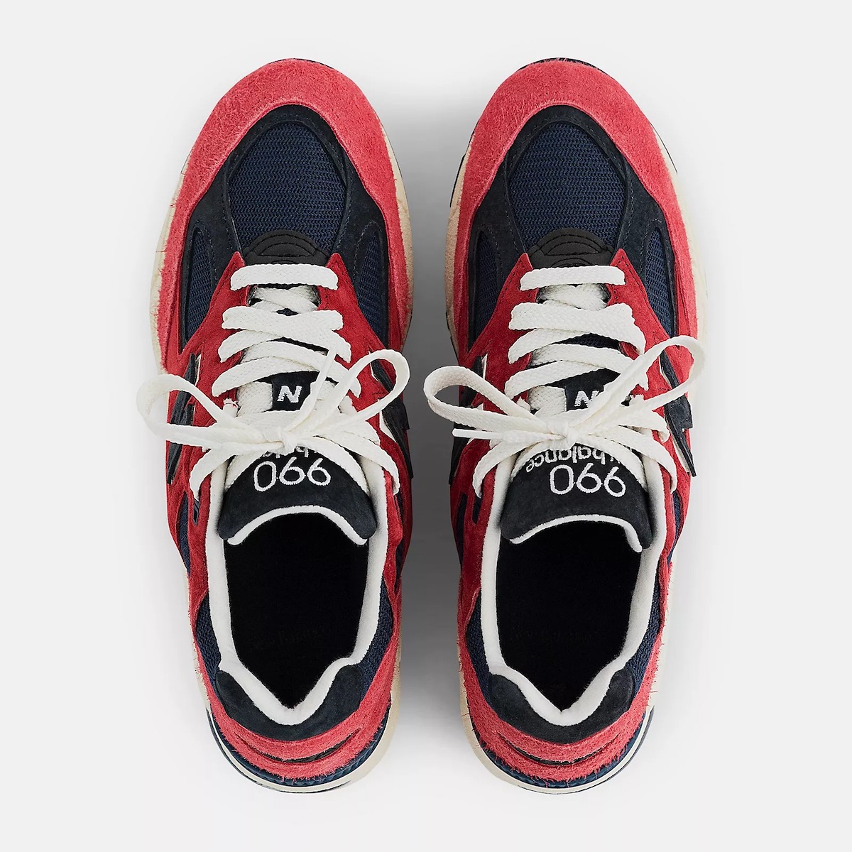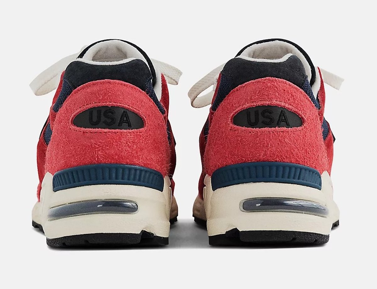 此次共带来两双美产 990,第一双 New Balance 990v2 “Chrysanthemum” 采用红色作为主调,辅以海军蓝色、黑色以及米白色点缀。