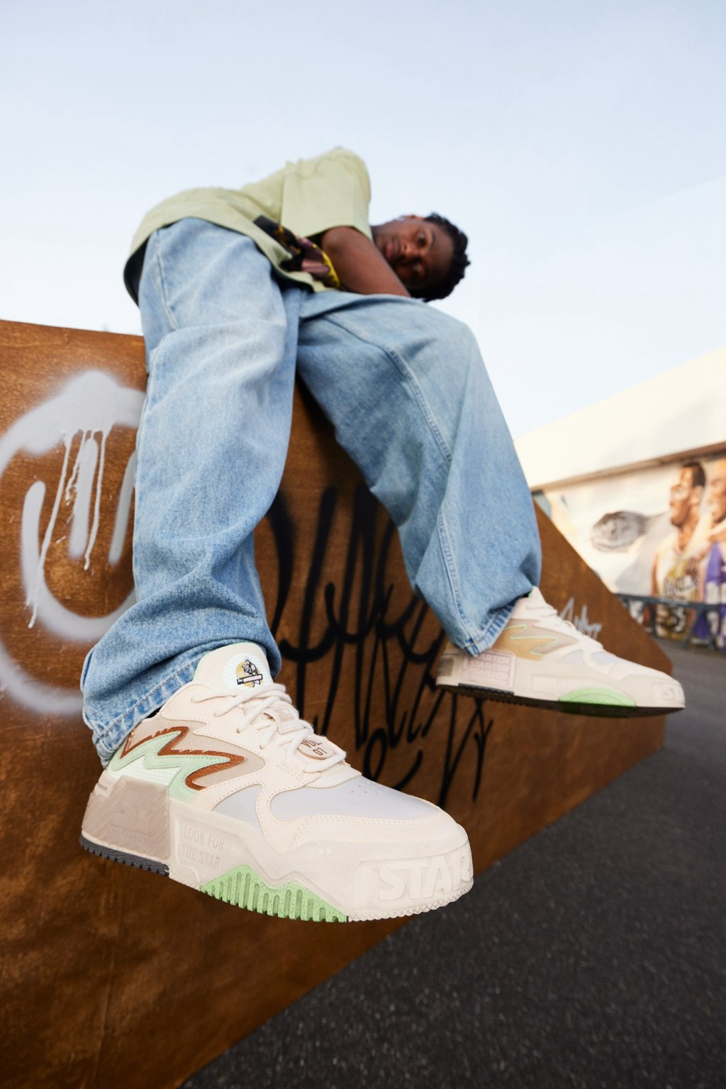特地选用 Knu Skool 鞋型,鞋身廓形肥大厚重,但又很容易搭配出不错穿搭效果。