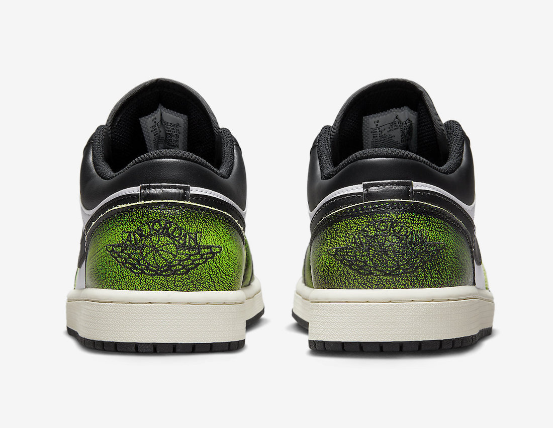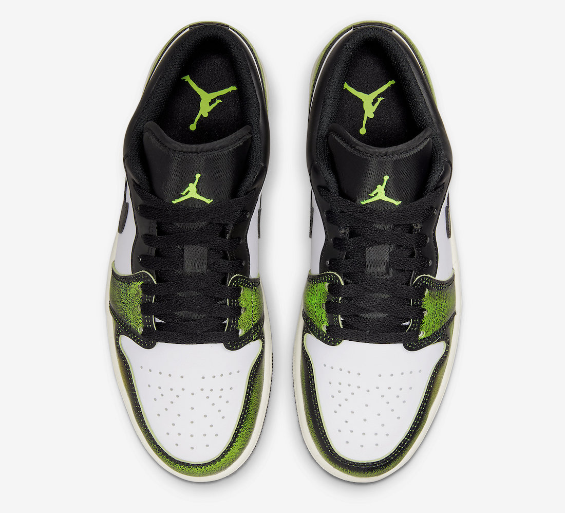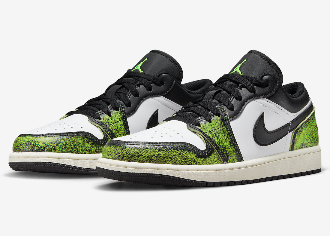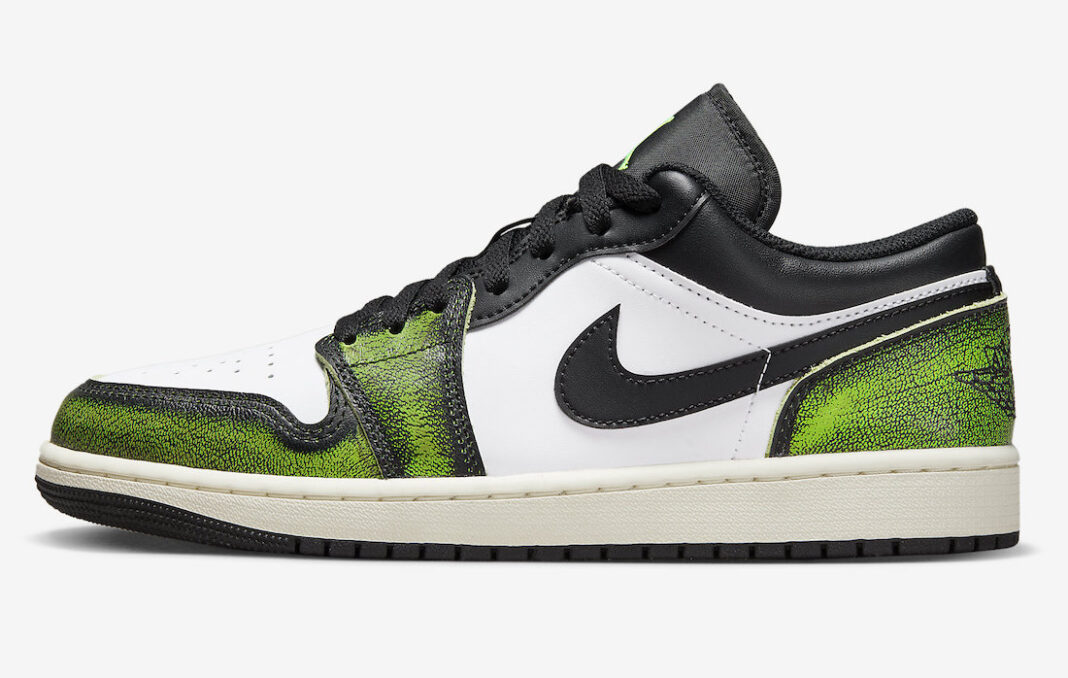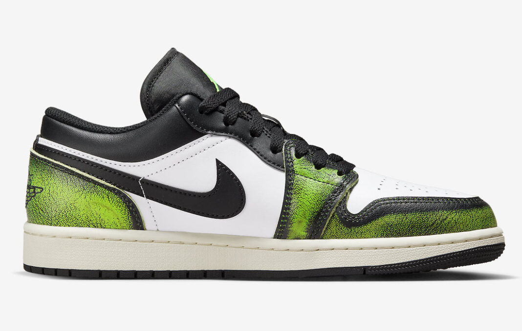 另一款则是低帮 Air Jordan 1 鞋型,做旧手法与芝加哥配色完全相同,只不过是将红色改为了亮绿色。