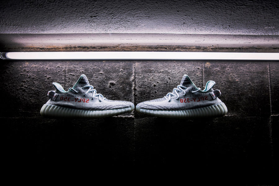 「冰蓝」配色的 Yeezy 350 在众多大地色装扮中显得尤为独特。
