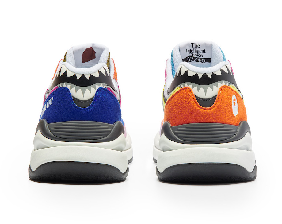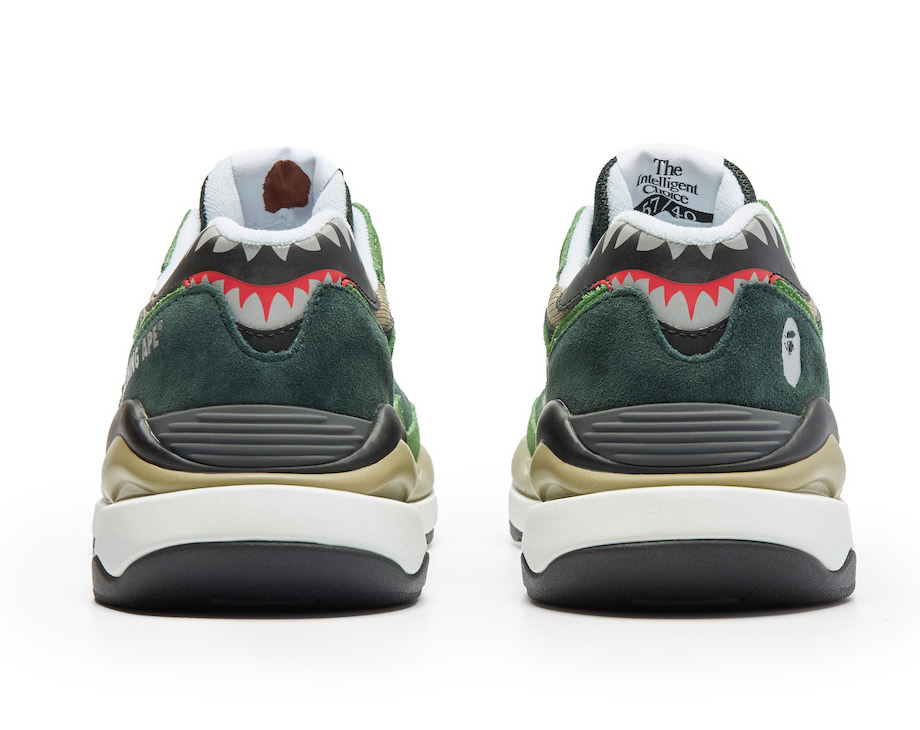 共有三款配色推出,一款代表 BAPE 的绿色,一款代表 New Balance 的灰色,还有一款 BAPE 服饰中常见的彩色拼接设计。