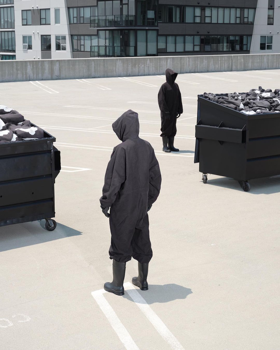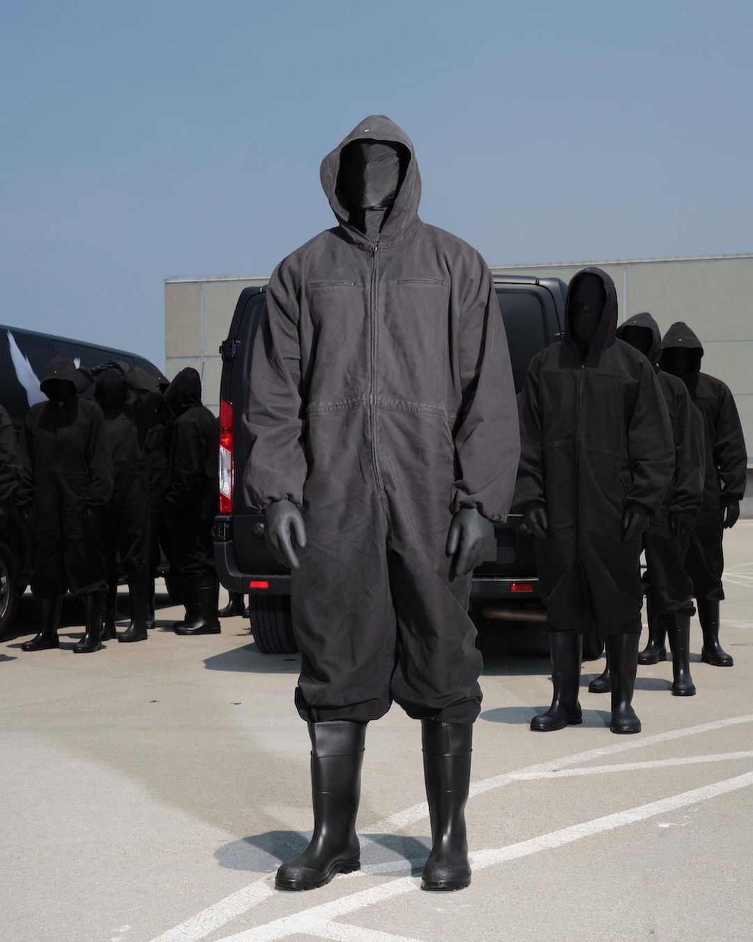工作人员驾驶着带有鸽子图案的货车出现在停车场,每个人都全副武装黑色系服装呈现出蒙面造型。