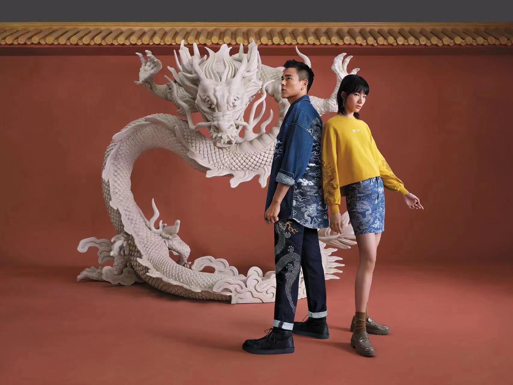 女款取材于 “红墙黄瓦” 中的黄色,袖口处点缀标志性龙纹图案,再搭配满印云纹的牛仔裙,同样极具辨识度。