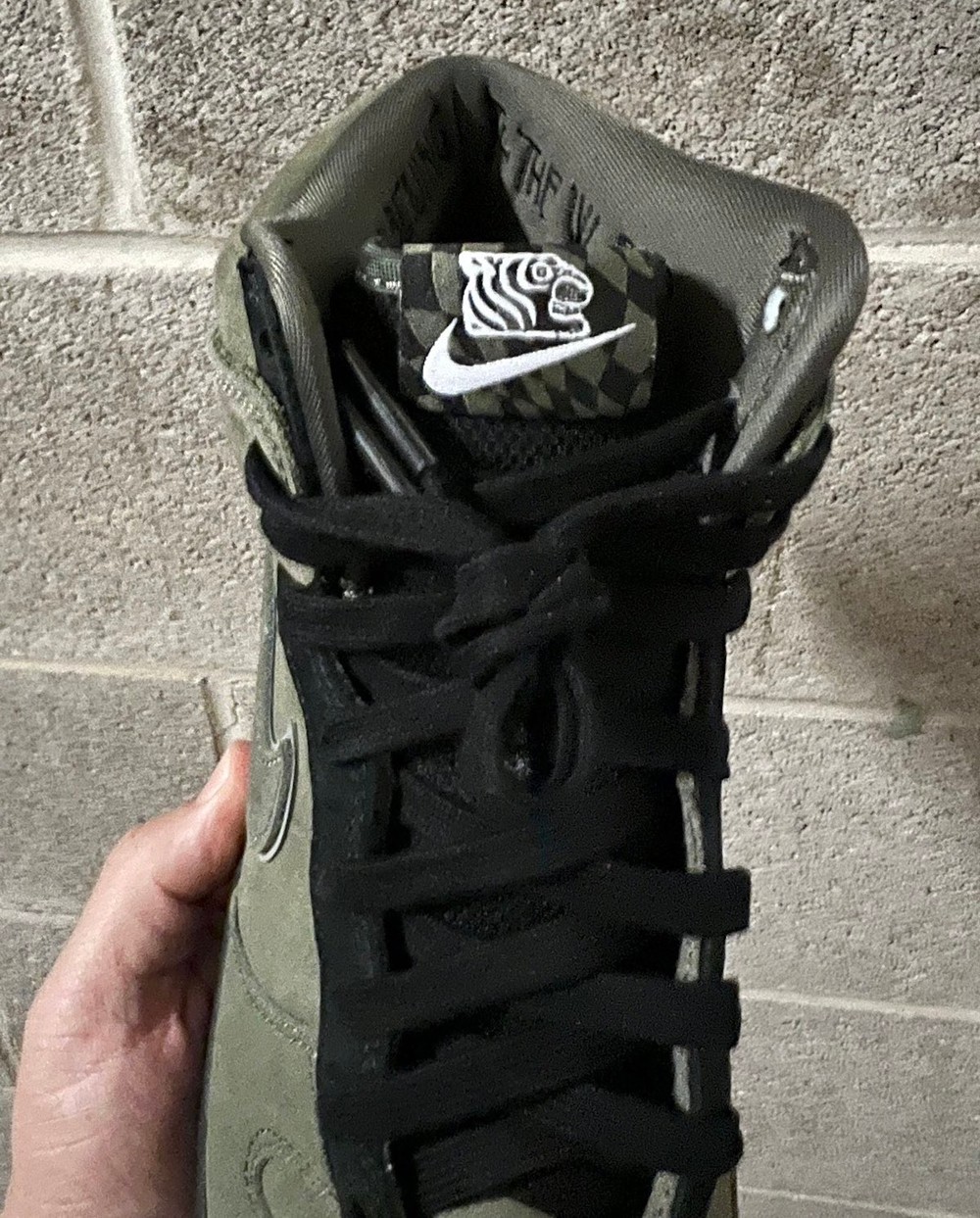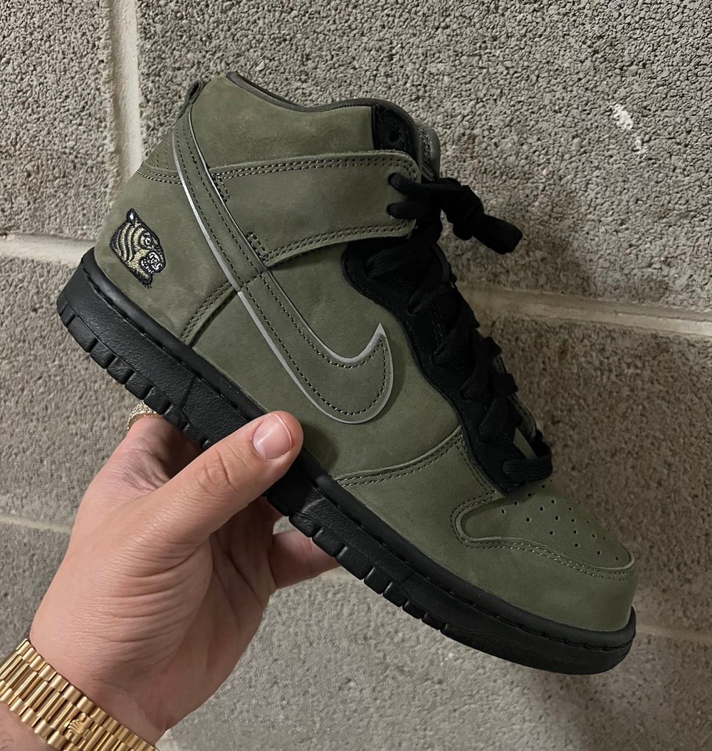 眼前这款刚刚曝光实物谍照的 SOULGOODS x Nike SB Dunk Hi,整体采用橄榄绿磨砂皮革构建鞋身,黑色覆盖鞋舌及大底部位。
