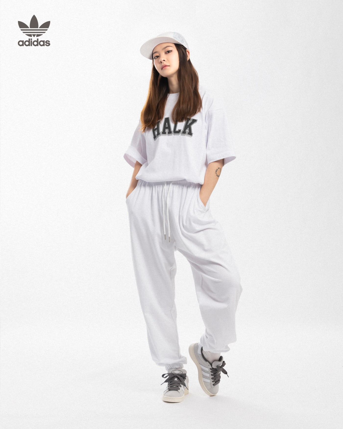 上身选择一件 HACK 字样的印花白 T 与之搭配,醒目又简洁,并且这个印花工艺不同于常规的胶印,摸上去有微微的绒毛感,质感独特又高级。