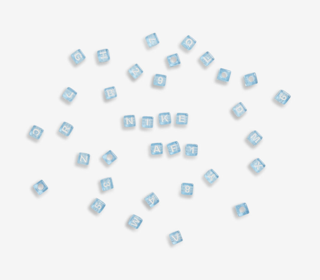 随鞋附赠半透明蓝色小方块,,可以拼出 “Nike”,“AF1”等字样。