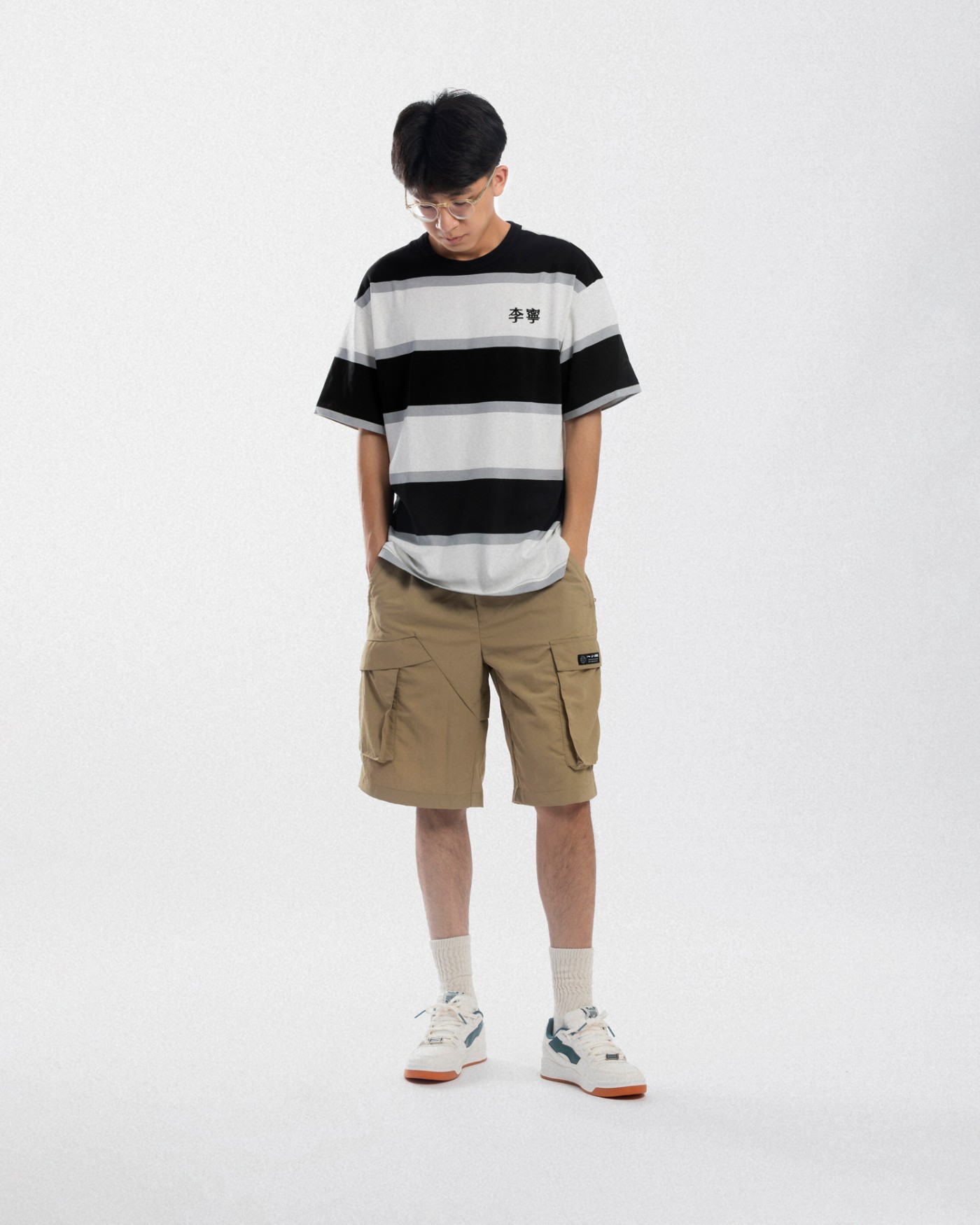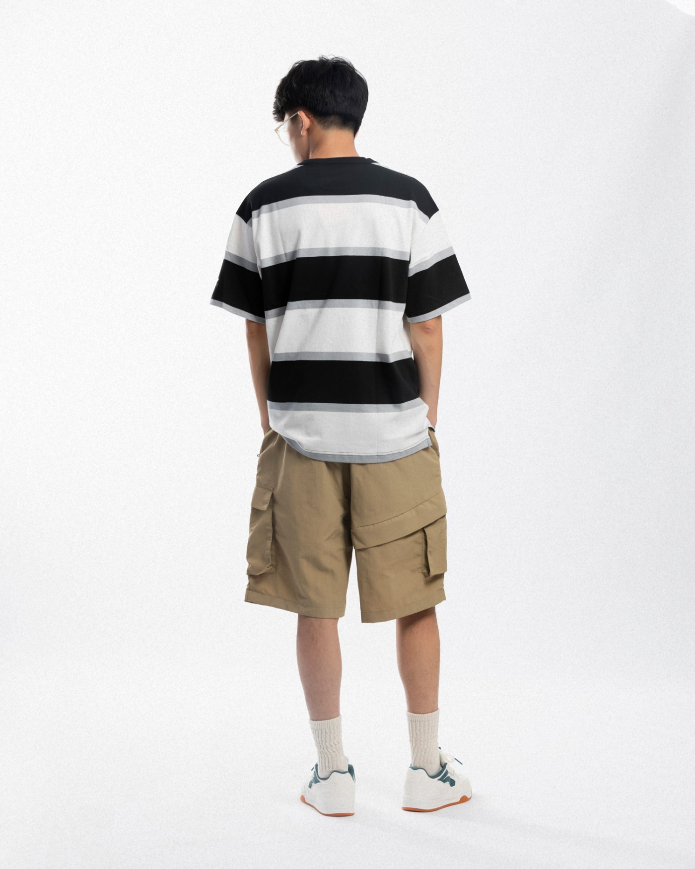 上身选择一件 City Boy 最爱的条纹 T 恤,搭配卡其色短裤,轻松搞定街头穿搭。