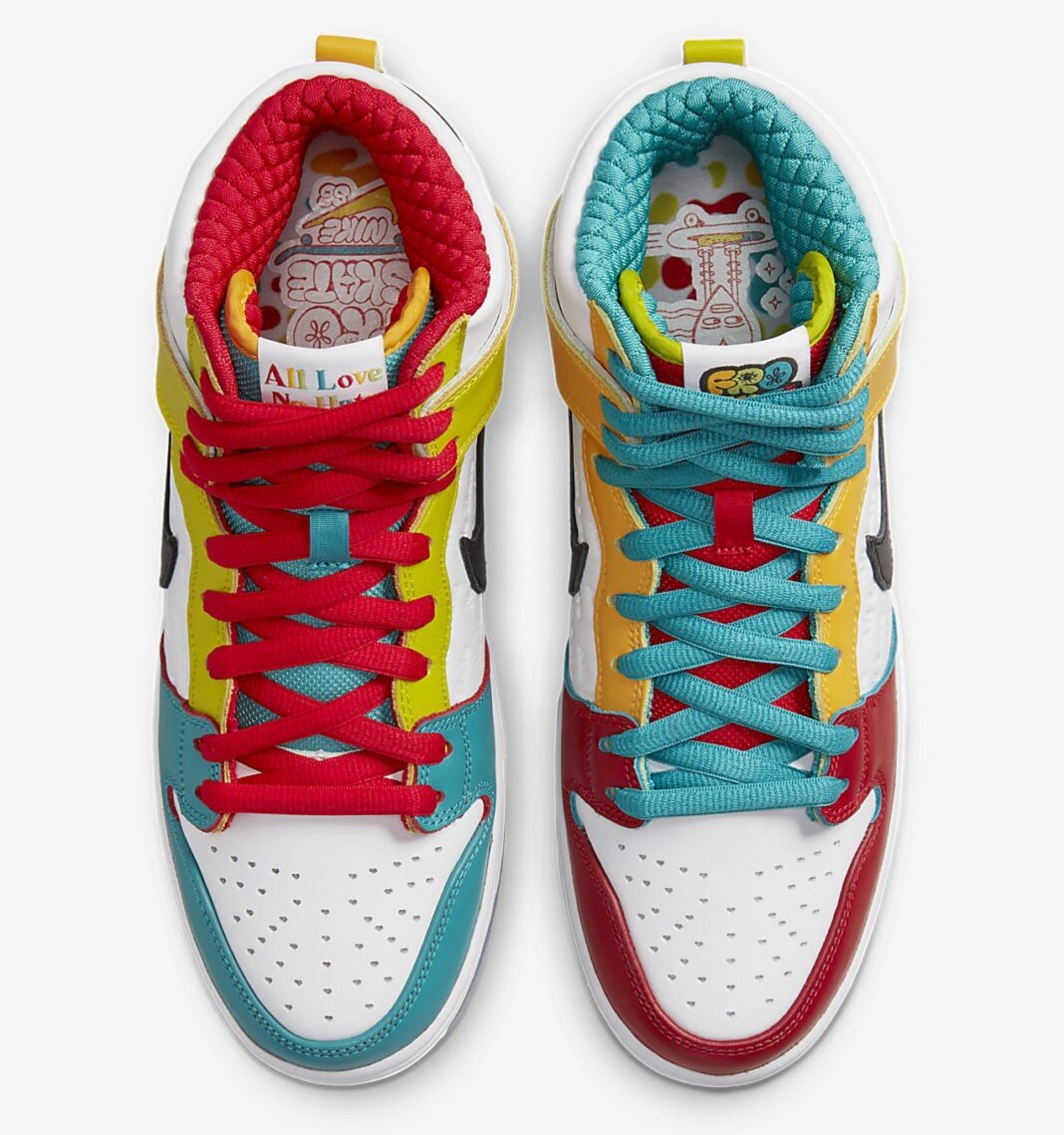 联名细节更是多到数不清,鞋头的心形冲孔、侧边中段的 “All Love, No Hate” 压印、鞋垫和外底内部满印的 FroSkate 标志性图案,都在彰显鞋款的特殊身份。