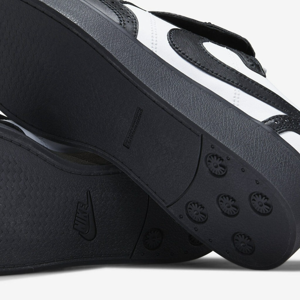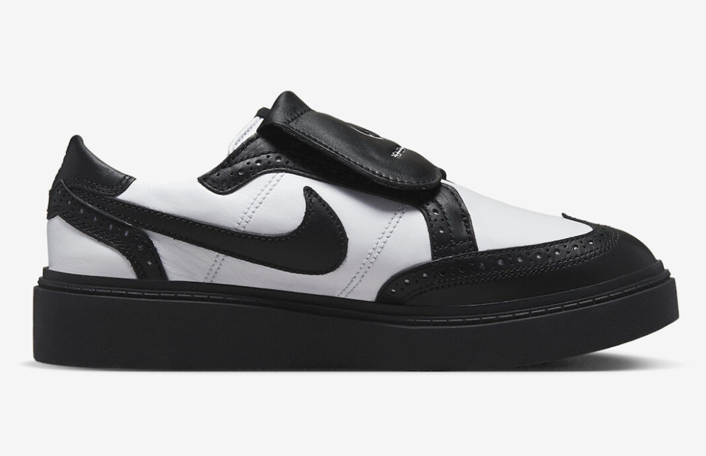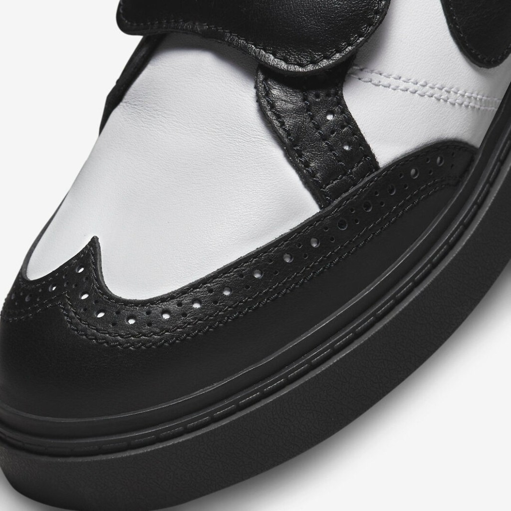 鞋面的雕花框架、外翻鞋舌、侧边 Swoosh 以及鞋底改为了黑色,呈现出经典百搭的「熊猫」风格。