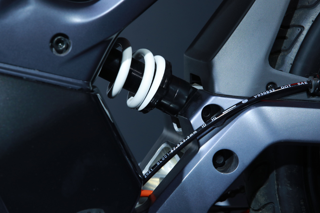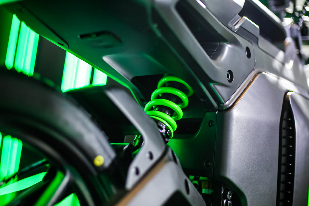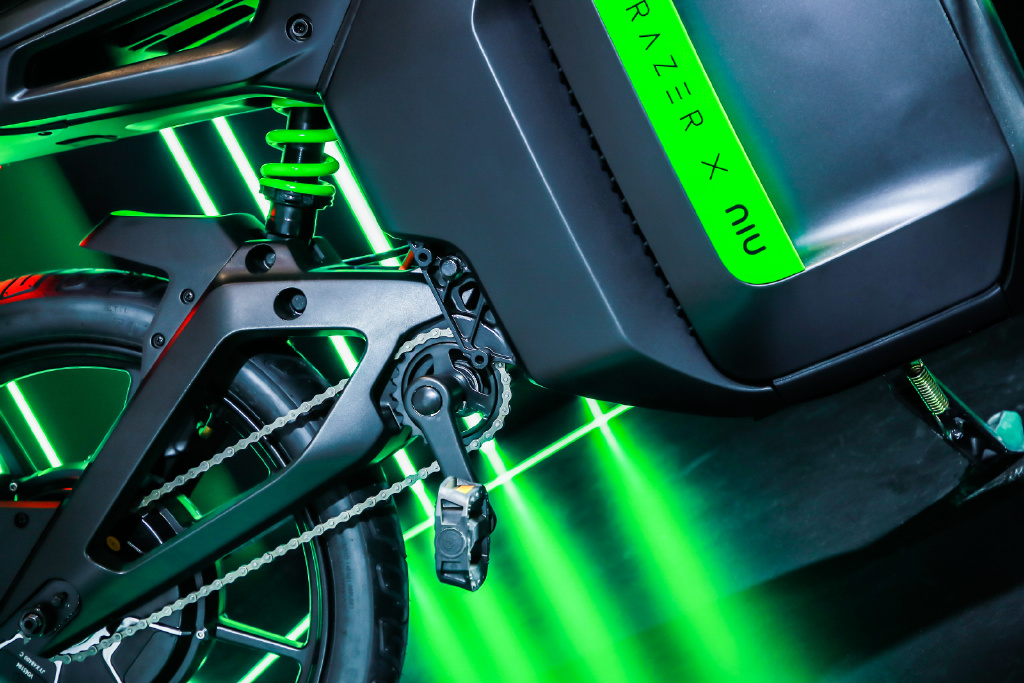 雷蛇联名加入了更酷炫的元素,整体以雷蛇标志性黑绿呈现,电池箱带有双方 Logo,后悬挂改用绿色弹簧。