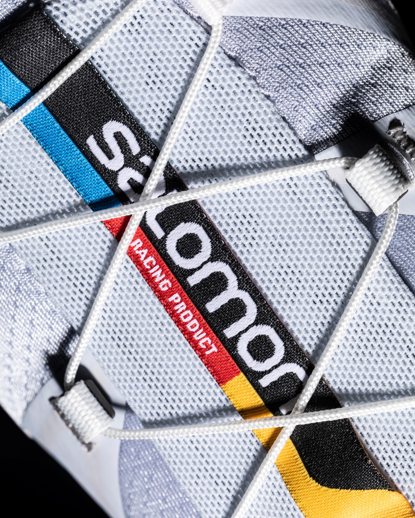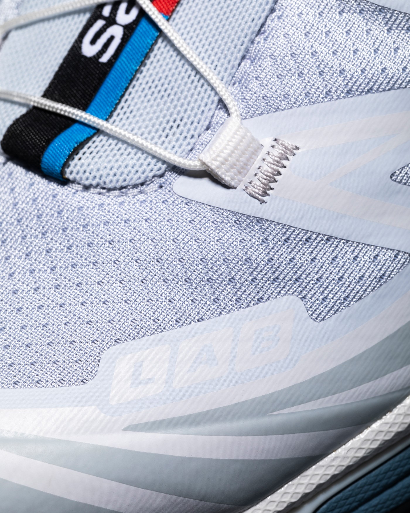 鞋面采用灰蓝色织物搭配浅蓝 + 白 + 灰三色热熔补强。