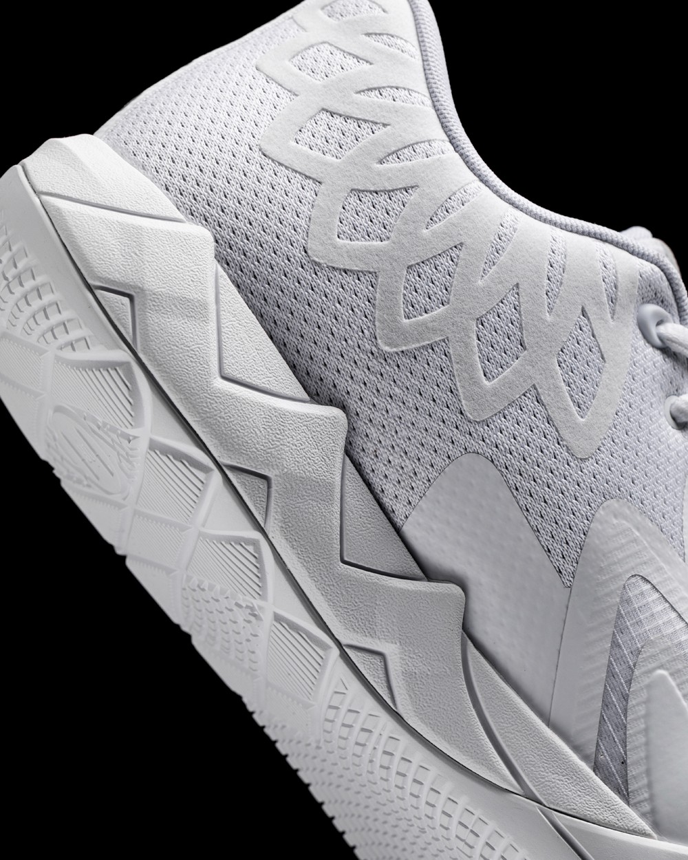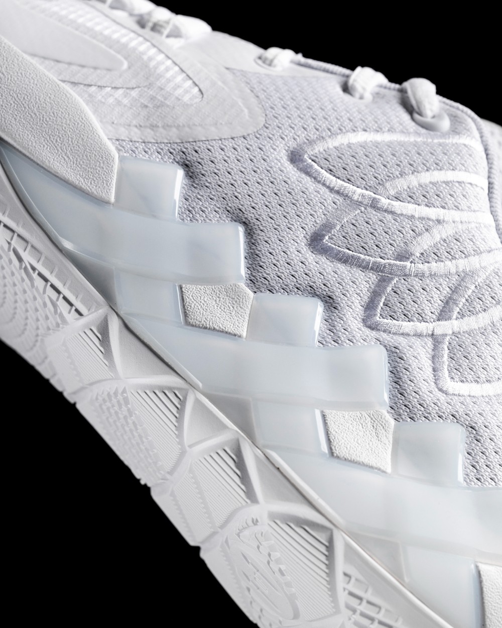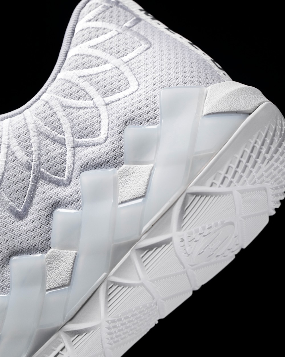 鞋身采用不同饱和度的白色织物和热熔材质覆盖,增加了独特的层次感,同时保证了轻量化。