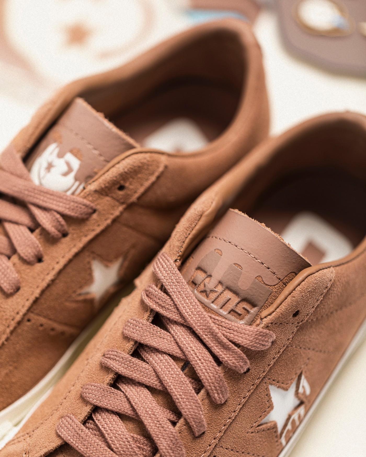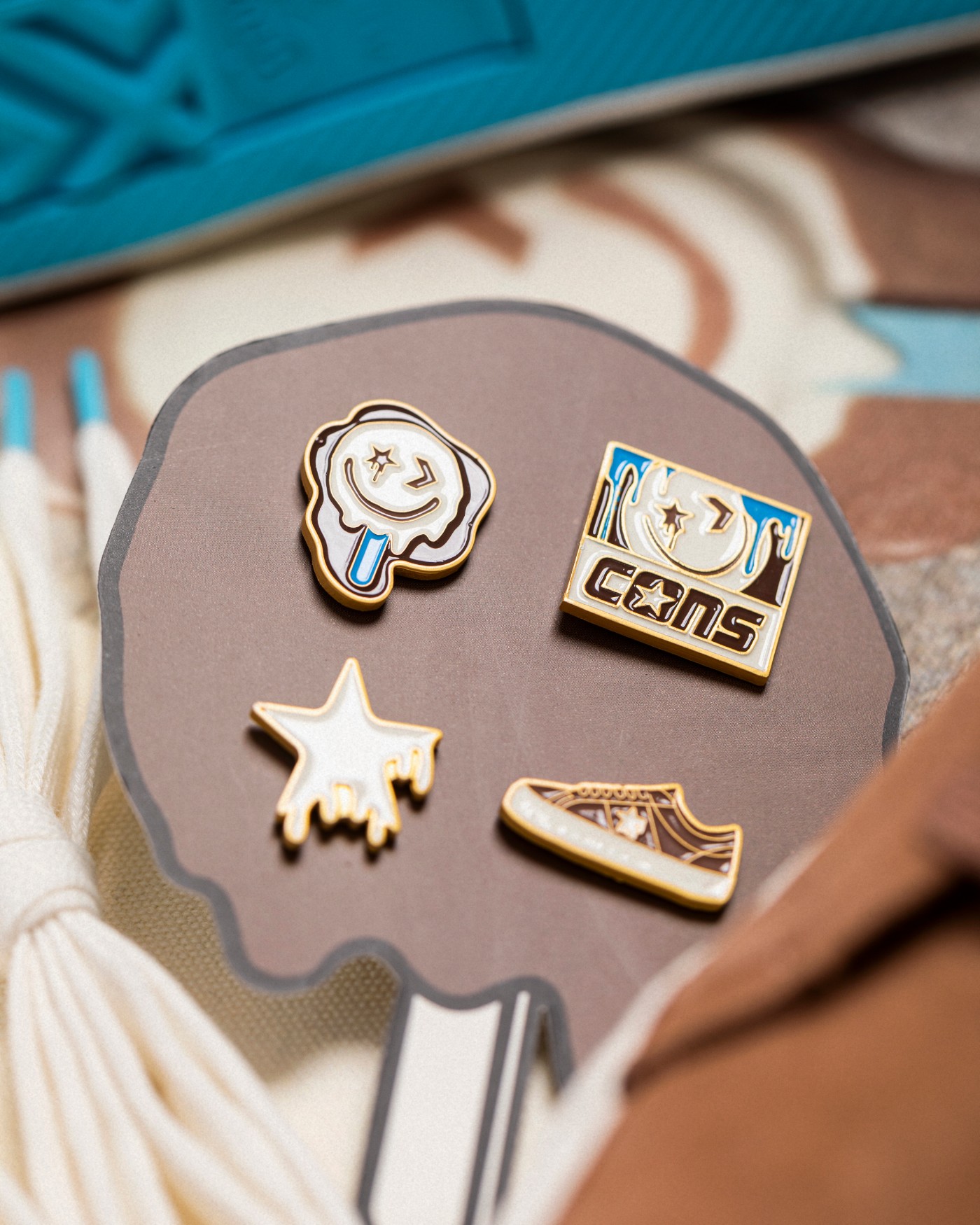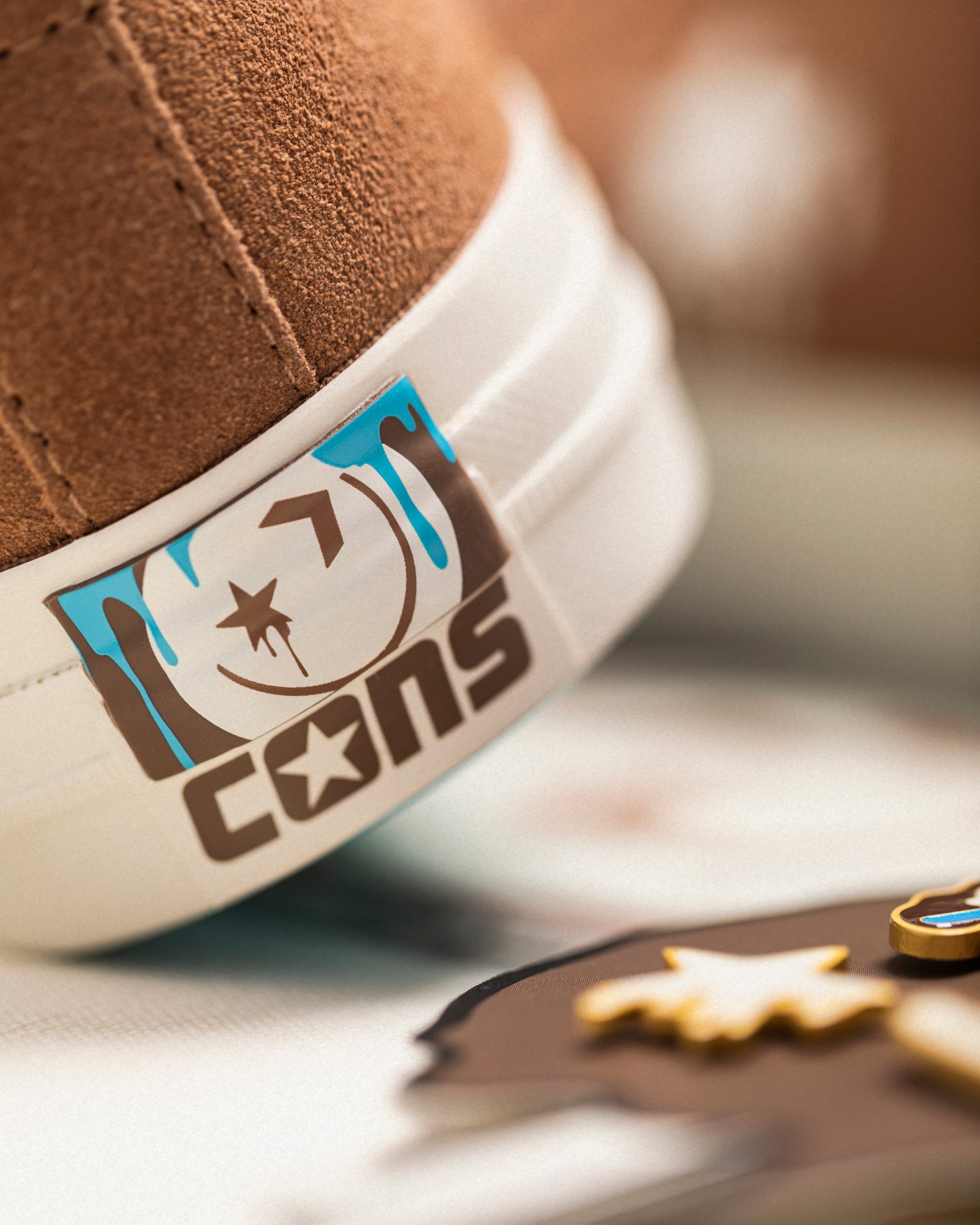 两脚鞋舌分别印有笑脸图案和 Converse Logo 并淋上「巧克力酱」,彰显鞋款身份。