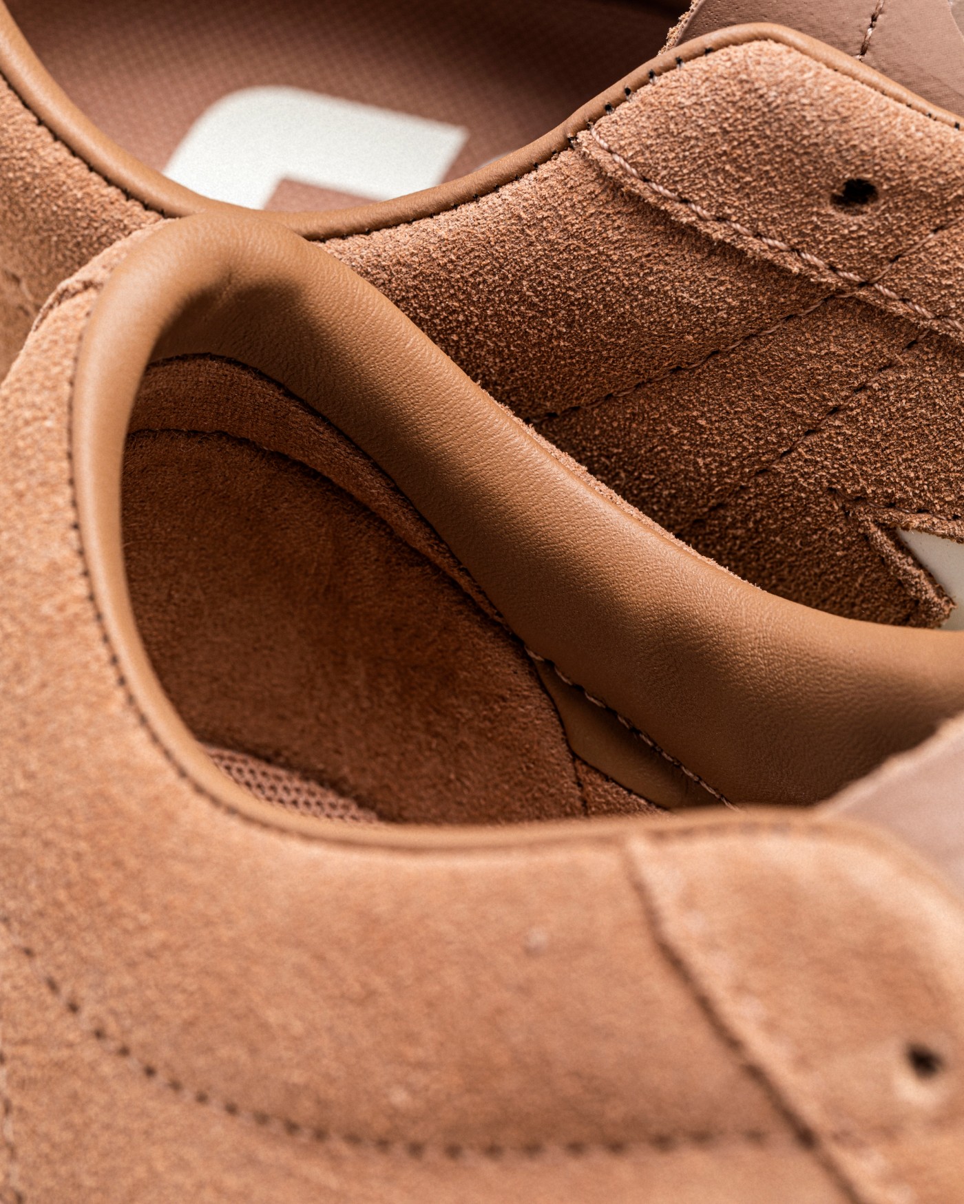 鞋身整体采用十分复古的棕色麂皮,呈现出如同巧克力般的丝滑质感。