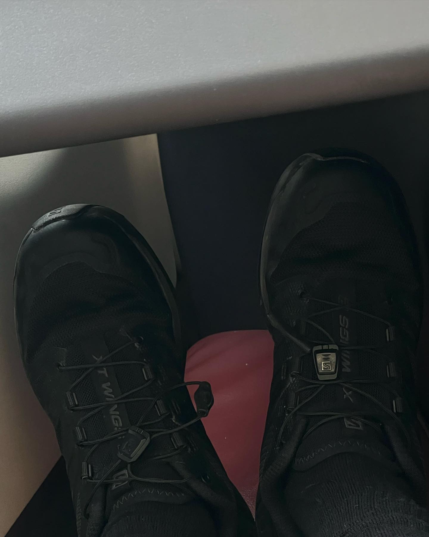 另一双则是她近期非常钟爱的 Salomon 鞋款,这次穿的是纯黑 XT-WINGS 2 鞋型。