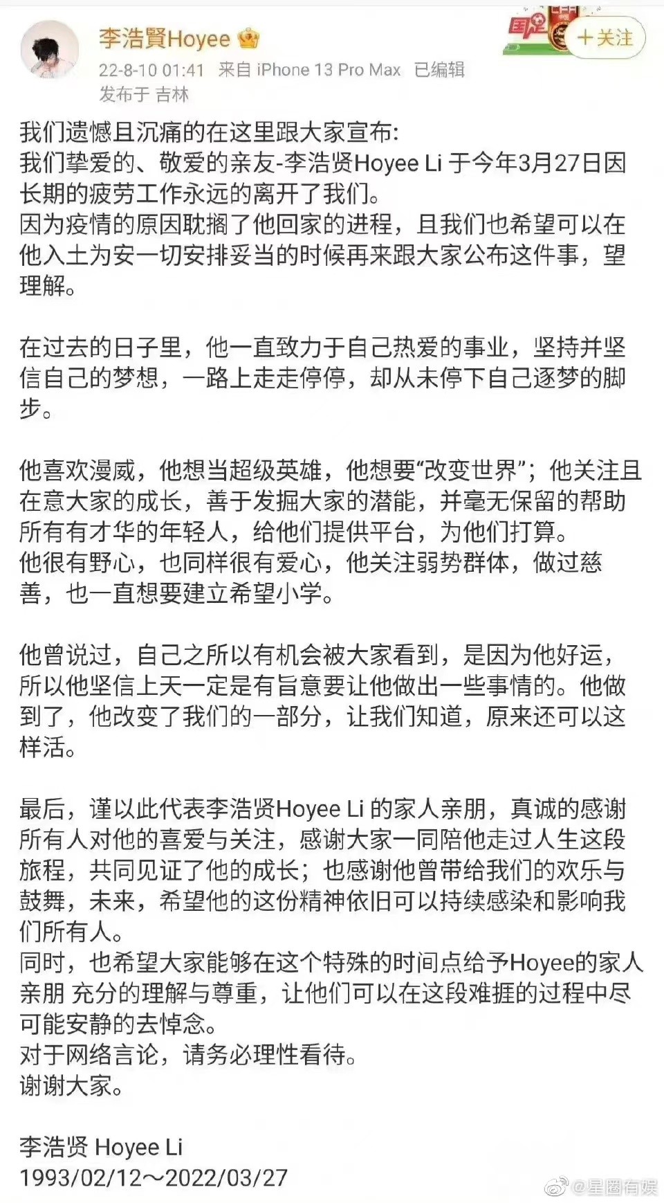 恰好近日刚刚释出消息,Starwalk 主理人,YeezySeason 卫衣华人模特李浩贤 Hoyee,于今年 3 月 27 日因劳累过度去世,年仅 29 岁。