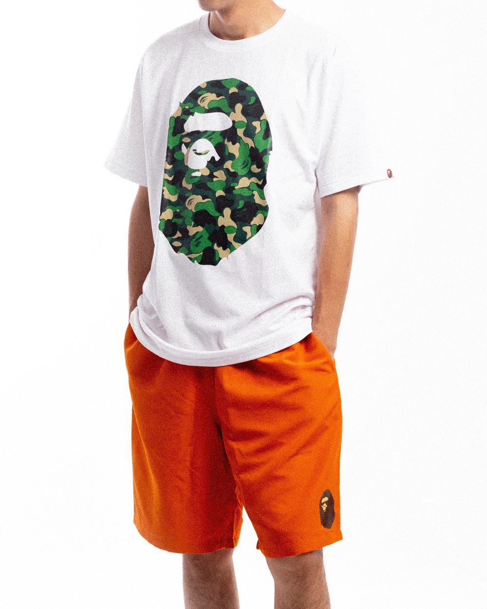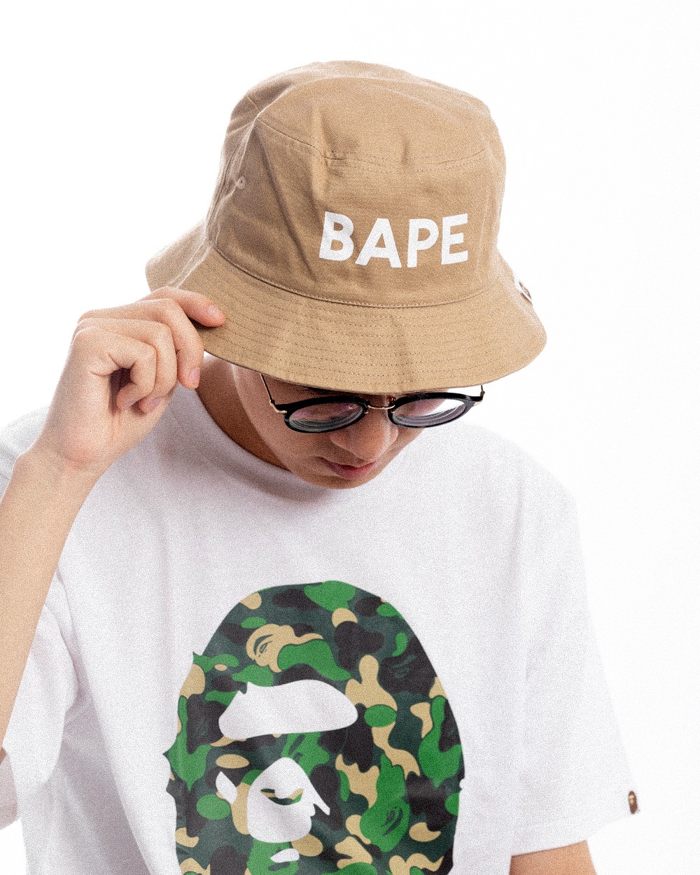 上身 BAPE® 猿人头 T 恤,搭配卡其色渔夫帽点缀,给人一种清爽的感觉。