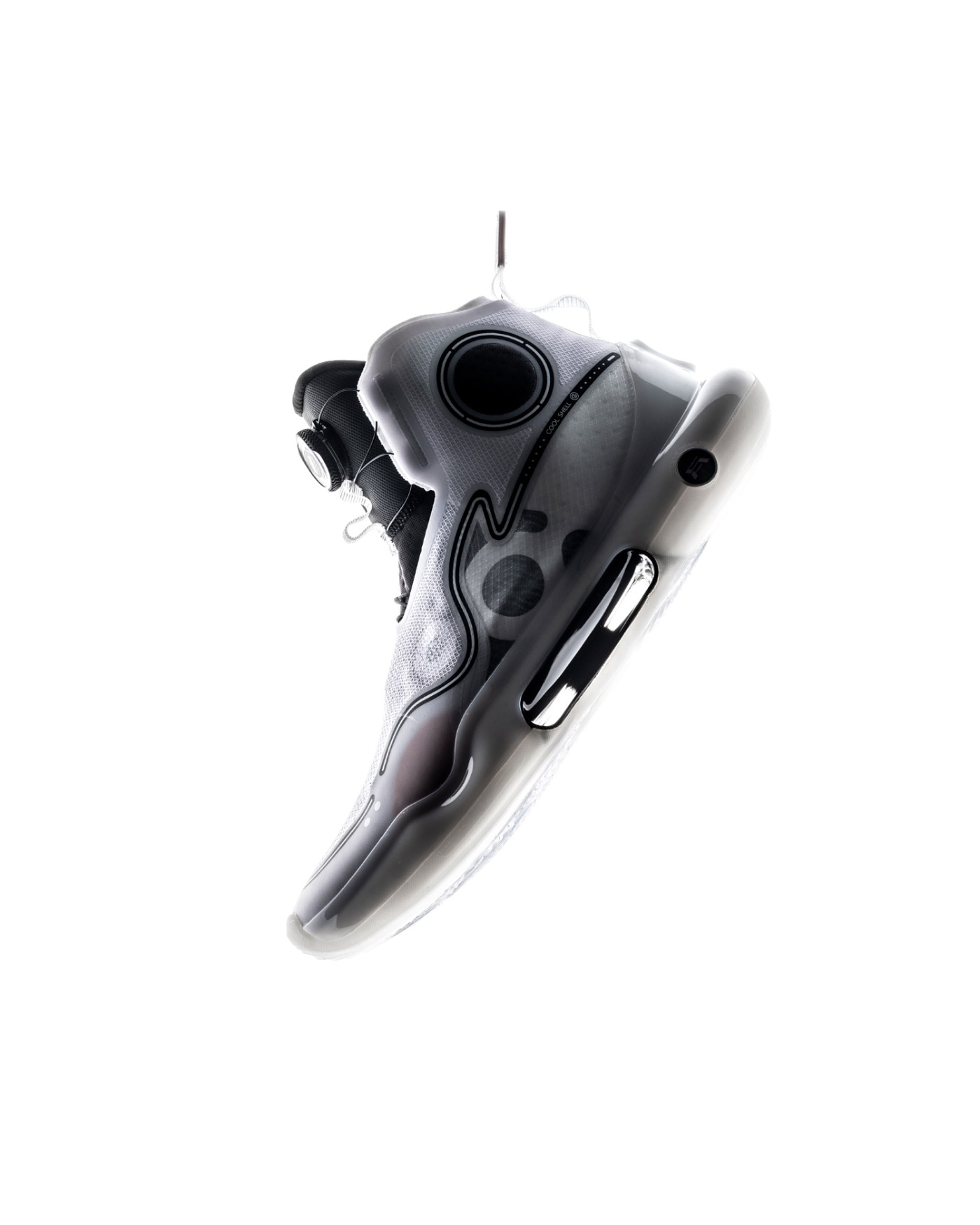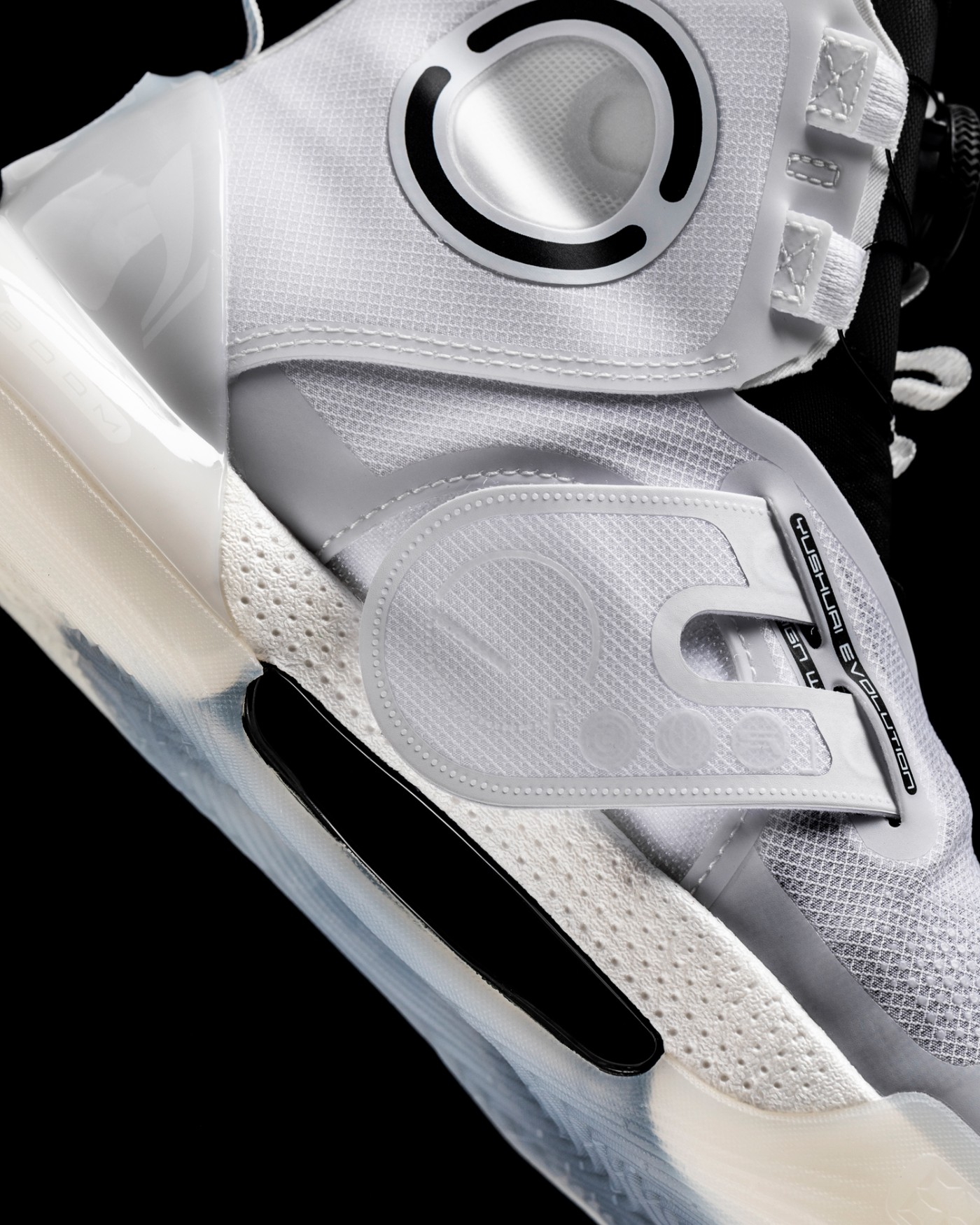 将李宁 Logo 融入鞋面线条,营造简约科幻的造型,凸显进化版的前卫属性。