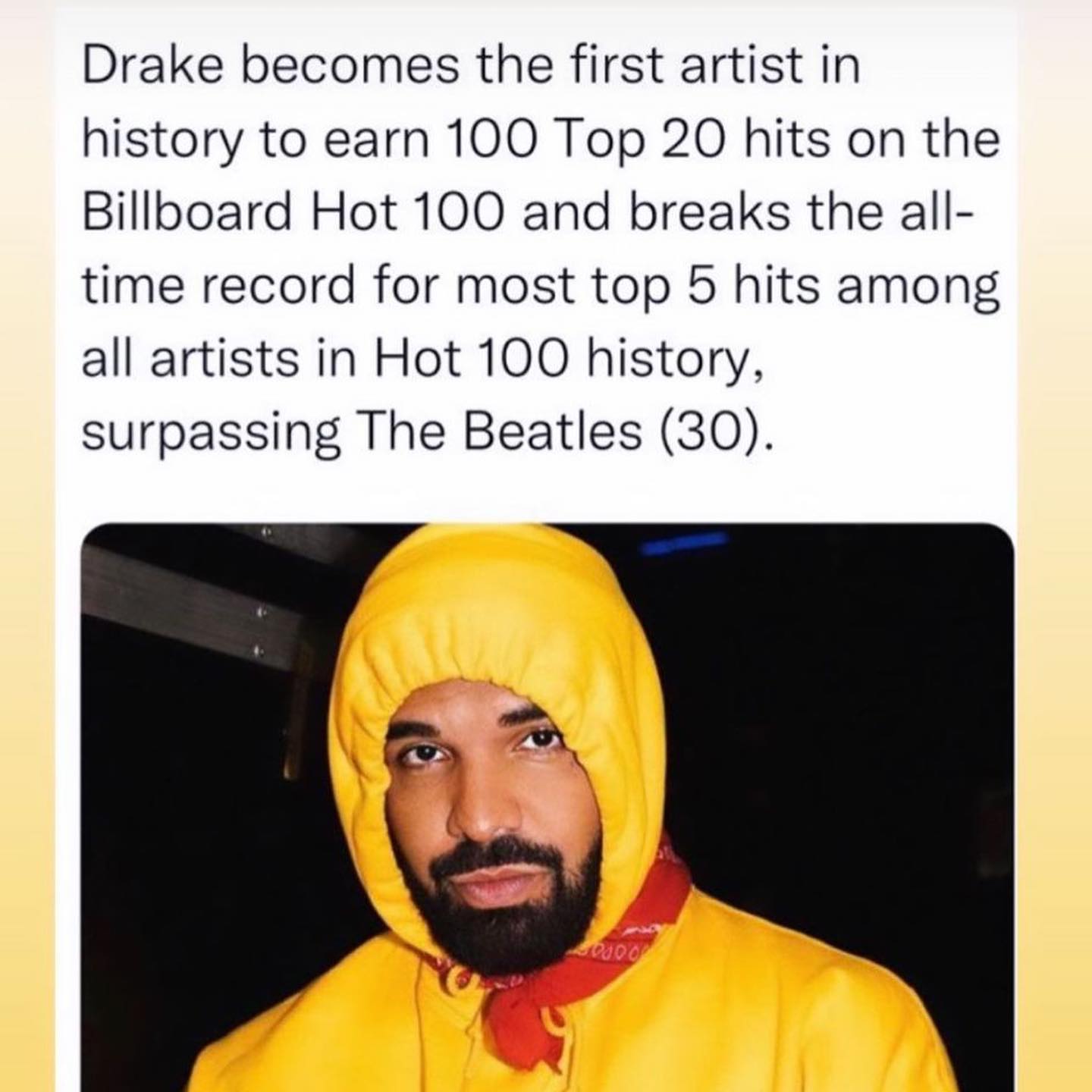 说唱歌手 Drake 再次打破历史记录,成为 Billboard Hot 100 单曲榜入围前 5 名次数最多的艺人。