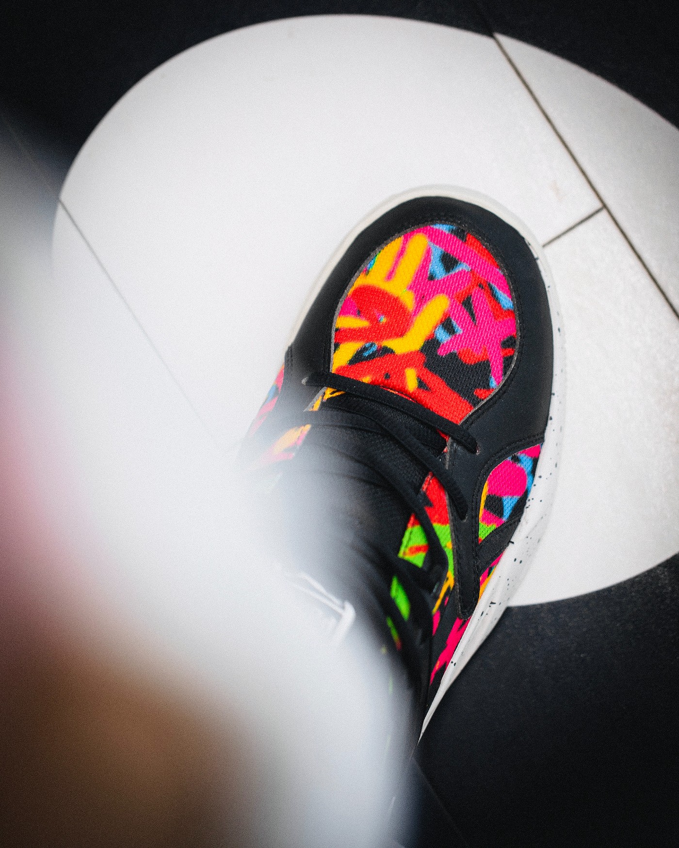 第二款配色走的则是更为花哨的路线,黑色框架下侧身填充多彩涂鸦效果妆点。