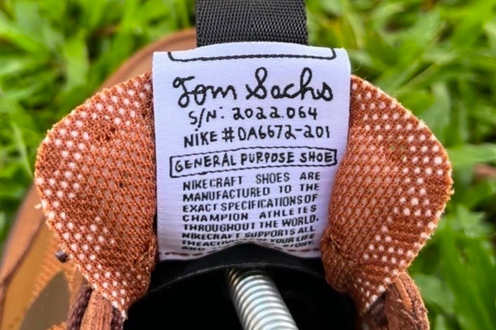 鞋舌织唛写有 Tom Sachs 风格的手写字体,强调个人风格。