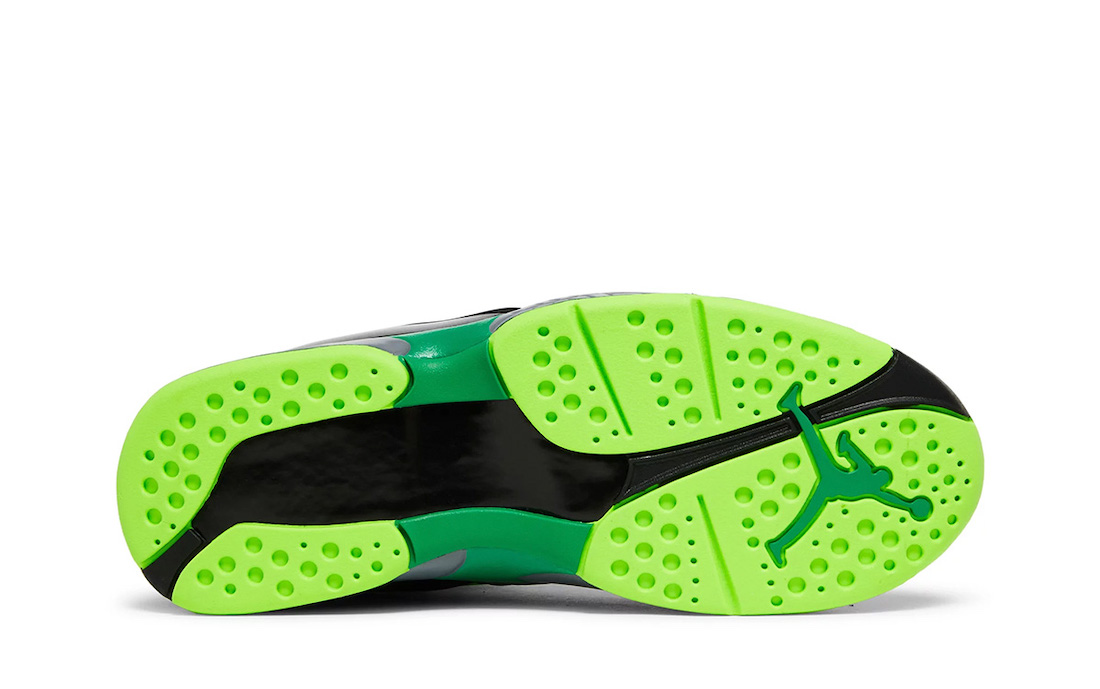 鞋身延续 Air Jordan 8 的经典交叉绑带造型,鞋舌醒目刺绣俄勒冈鸭卡通 Logo,细节辅以绿色金属质感点缀,依旧是让人难以抗拒的标志性俄勒冈 PE 气质。