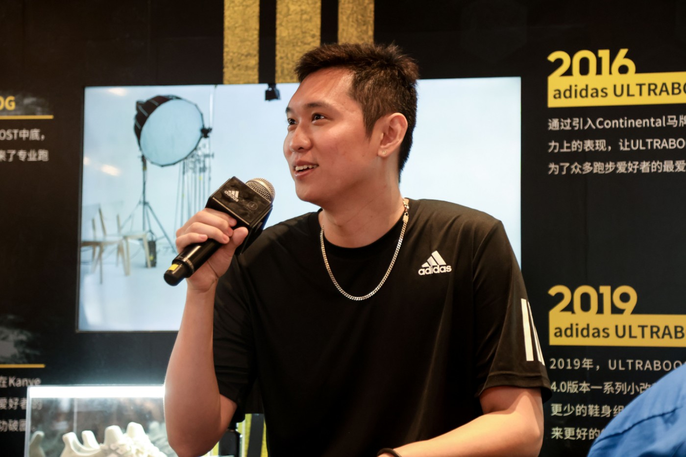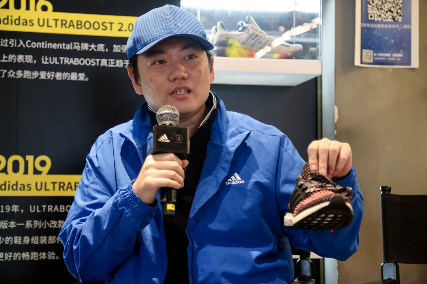 潮鞋文化推广人程旸为前来参观的嘉宾们讲述了 ULTRABOOST 跑鞋产品的独特之处。