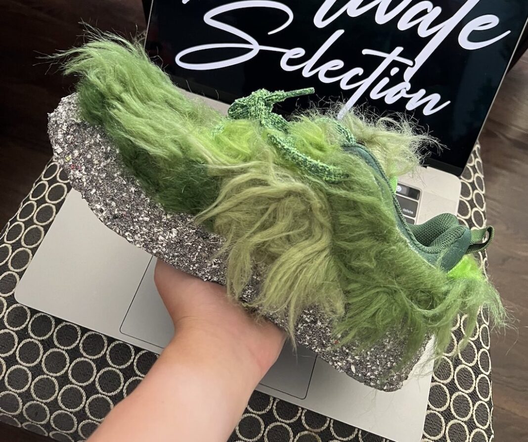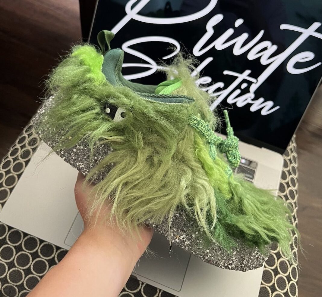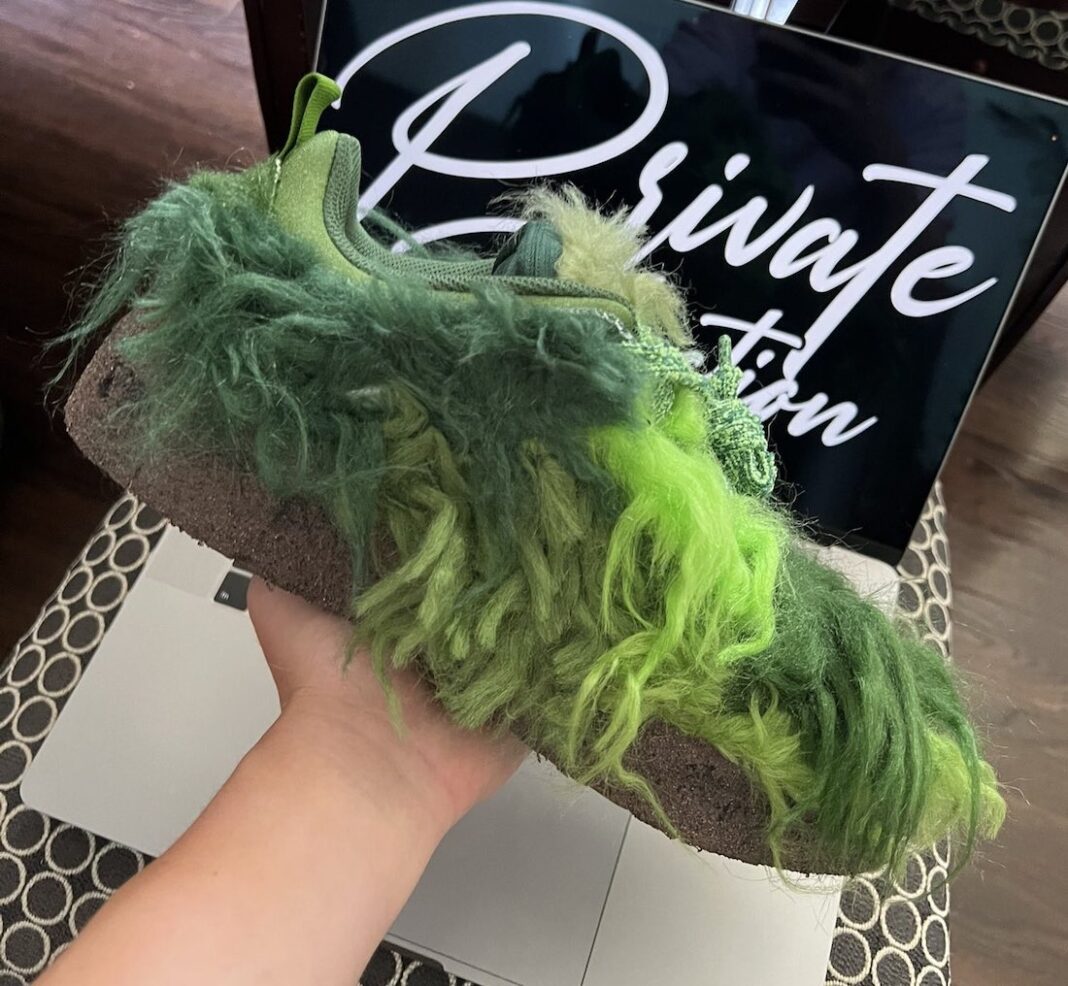 设计灵感来源于著名儿童动画角色绿毛怪格林奇,鞋身布满了深浅不一的绿色长毛,乍一看还以为是个盆栽。